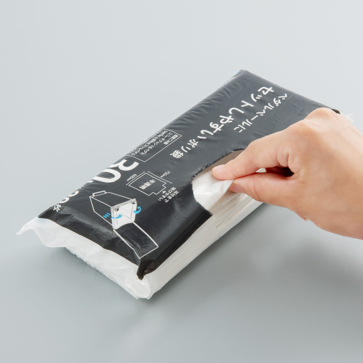 必要なときに1枚ずつサッと取り出せる、使い勝手の良いゴミ袋です。パッケージはコンパクトな省スペース設計。キッチンの引き出しや棚など、ちょっとした隙間にもすっきり収納できます。