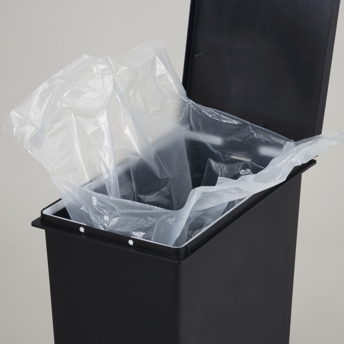 UNEEDのゴミ箱、ペダルペールにちょうどよいサイズのゴミ袋20Lです。袋止めにきれいにセットでき、前後がもたつかずスッキリ設置できます。
