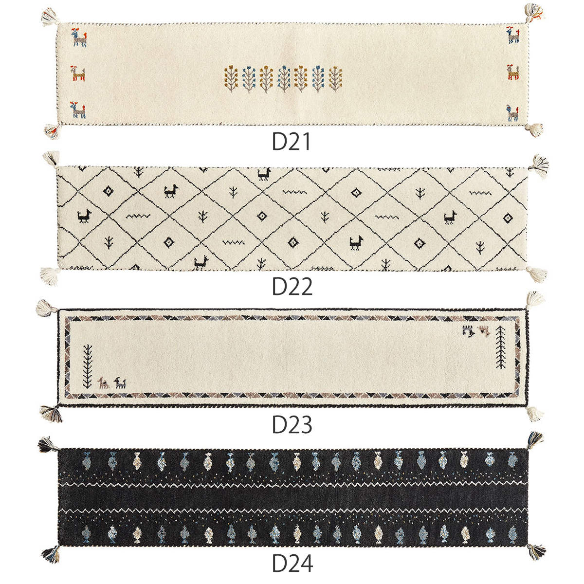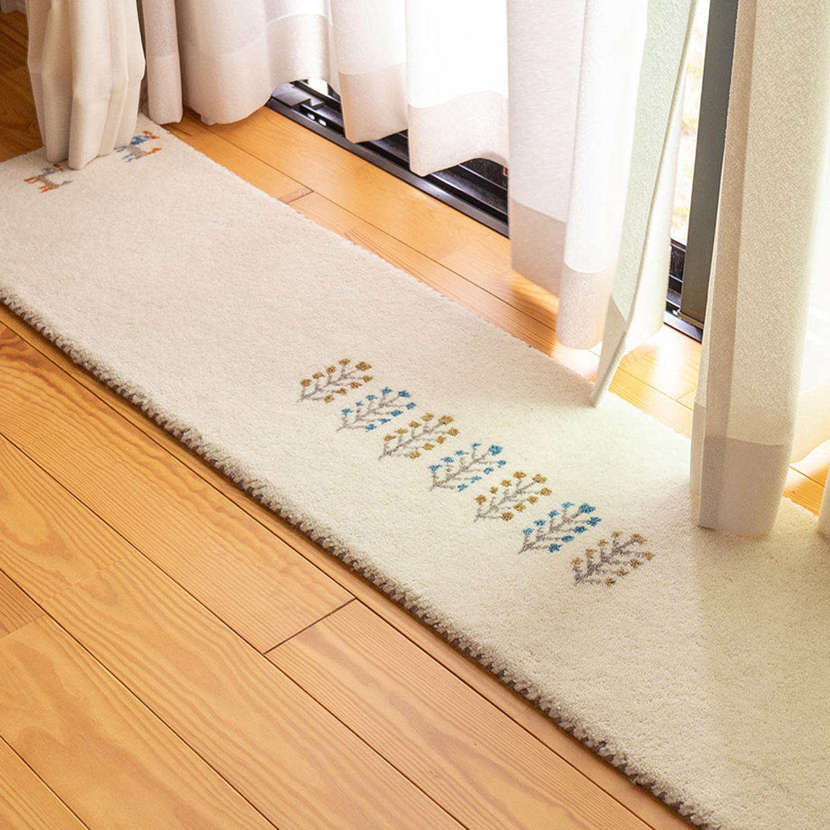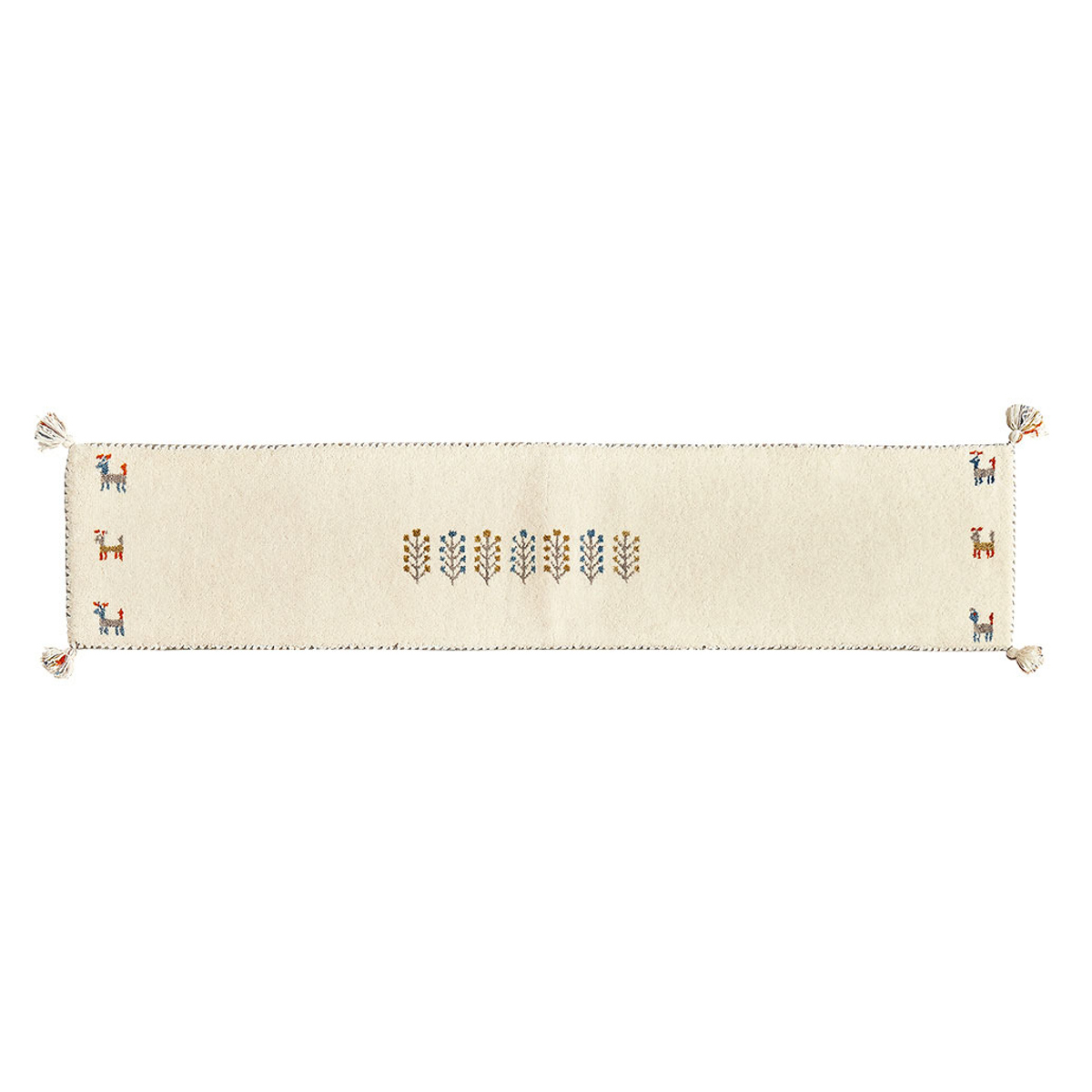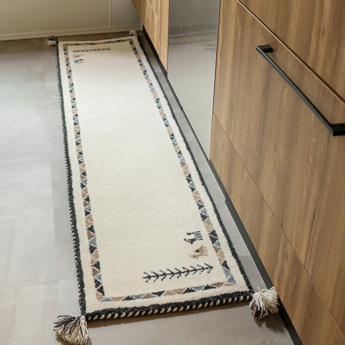 ギャッベではめずらしい横向きのデザインです。通常は縦柄が多い中、横向きの柄を織り上げるには高い技術が必要とされており、職人の確かな技が感じられます。キッチンマットなどは横長に敷くことが多いため、柄を正面から楽しめる点も魅力です。