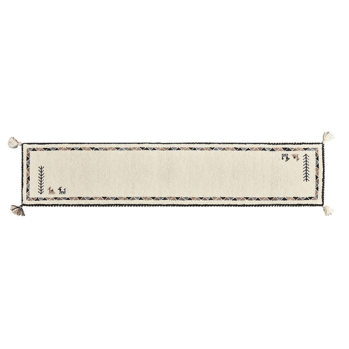 ギャッベではめずらしい横向きのデザインです。通常は縦柄が多い中、横向きの柄を織り上げるには高い技術が必要とされており、職人の確かな技が感じられます。キッチンマットなどは横長に敷くことが多いため、柄を正面から楽しめる点も魅力です。