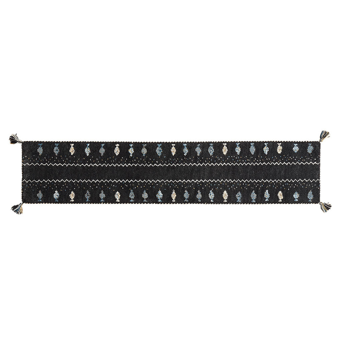 ギャッベではめずらしい横向きのデザインです。通常は縦柄が多い中、横向きの柄を織り上げるには高い技術が必要とされており、職人の確かな技が感じられます。キッチンマットなどは横長に敷くことが多いため、柄を正面から楽しめる点も魅力です。
