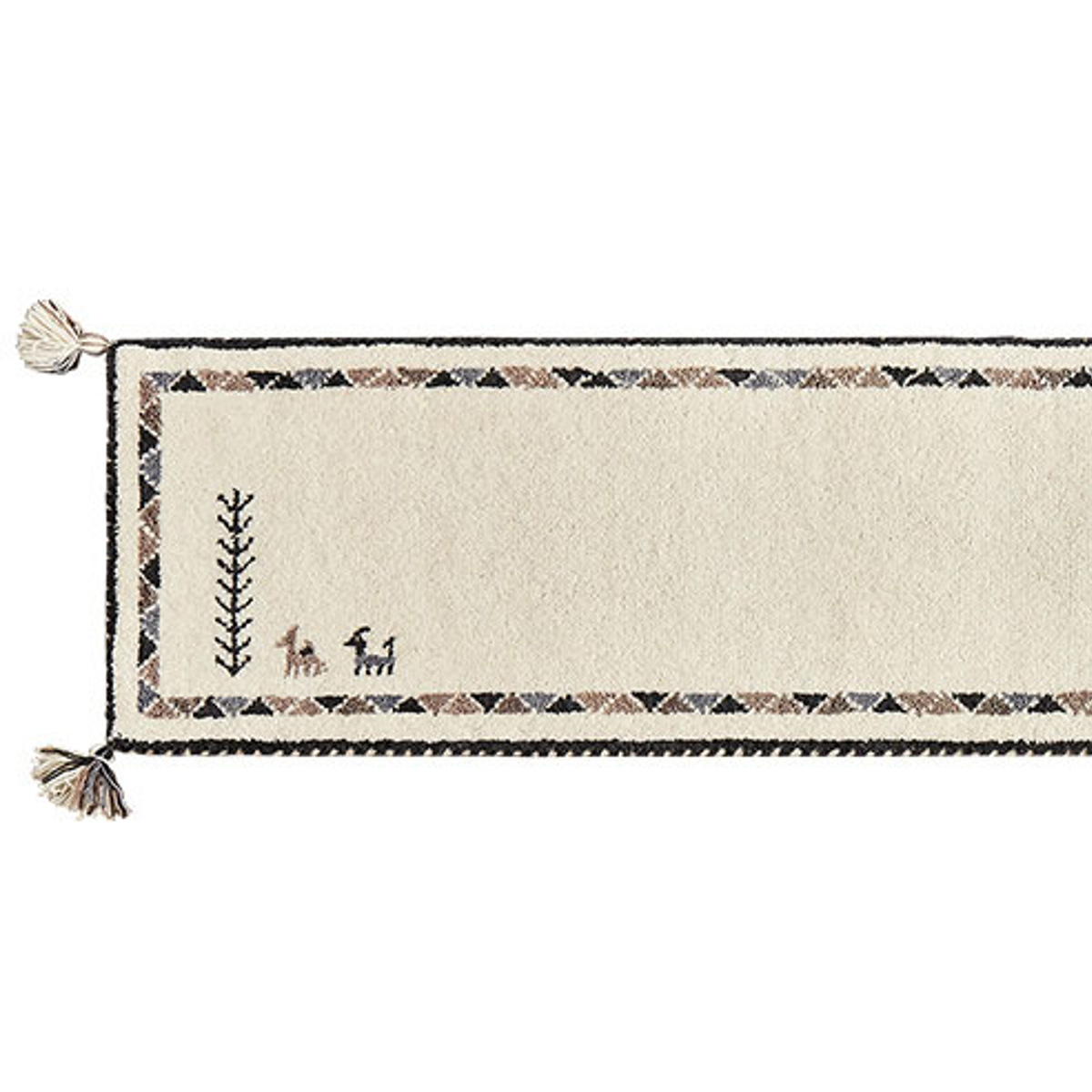 ギャッベではめずらしい横向きのデザインです。通常は縦柄が多い中、横向きの柄を織り上げるには高い技術が必要とされており、職人の確かな技が感じられます。キッチンマットなどは横長に敷くことが多いため、柄を正面から楽しめる点も魅力です。