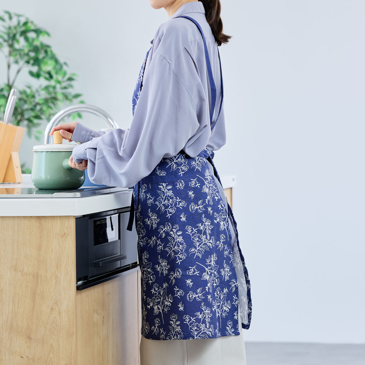 パターンやポケットの配置も見直し、見た目と使いやすさの両方にこだわった仕上がりです。両サイドにポケットがあり、スマホや小物を入れておくのにも便利です。繊細なボタニカル柄が落ち着いた雰囲気を演出し、家事の時間でも上品な装いを楽しめます。