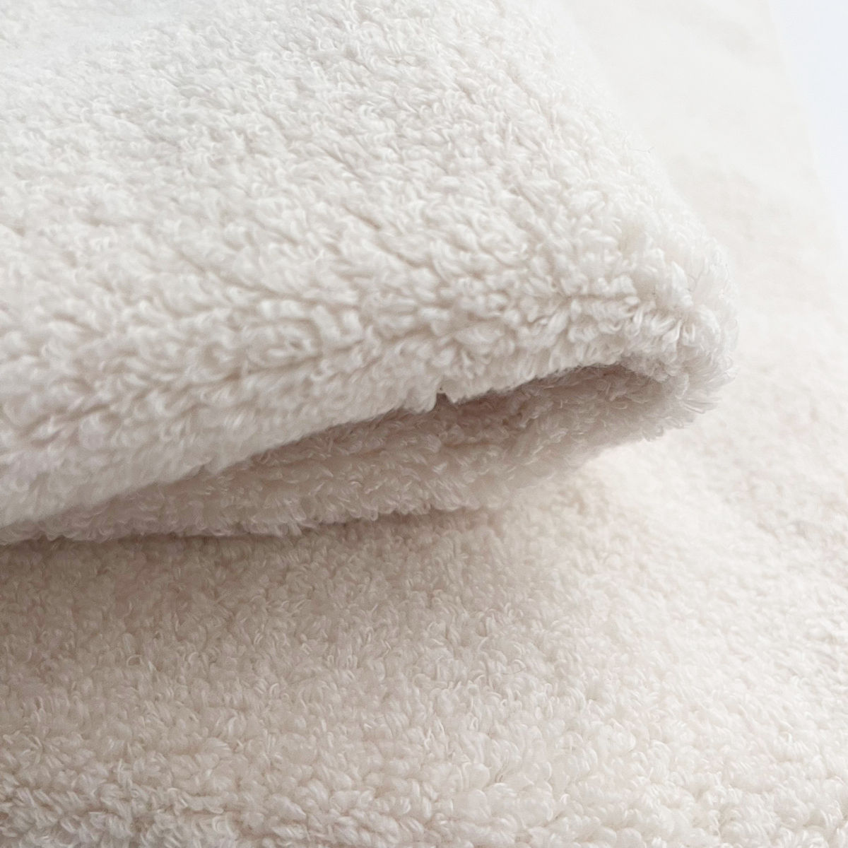 ふわふわでボリューム感たっぷりのパイル地は綿100%です。毛羽落ちも少なく、柔らかな肌ざわりは、お肌が敏感な方や小さなお子様でも安心してお使いいただけます。
