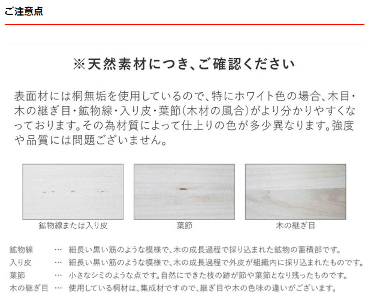 | 材質 | 表面材:桐無垢材 天板:強化シート 脚部:アイアン脚(ブラック) 塗装:ウレタン樹脂塗装 引出し:桐箱組(ロッキング組) 垣板厚1.6cm、底板0.5cm |