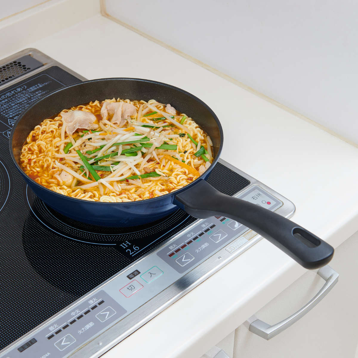 パスタや餃子などさまざまな料理に使いやすいサイズです。深型なので、炒め物をしても食材が飛び出しにくく、油ハネが気になる天ぷらなどの揚げ物調理にも便利です。