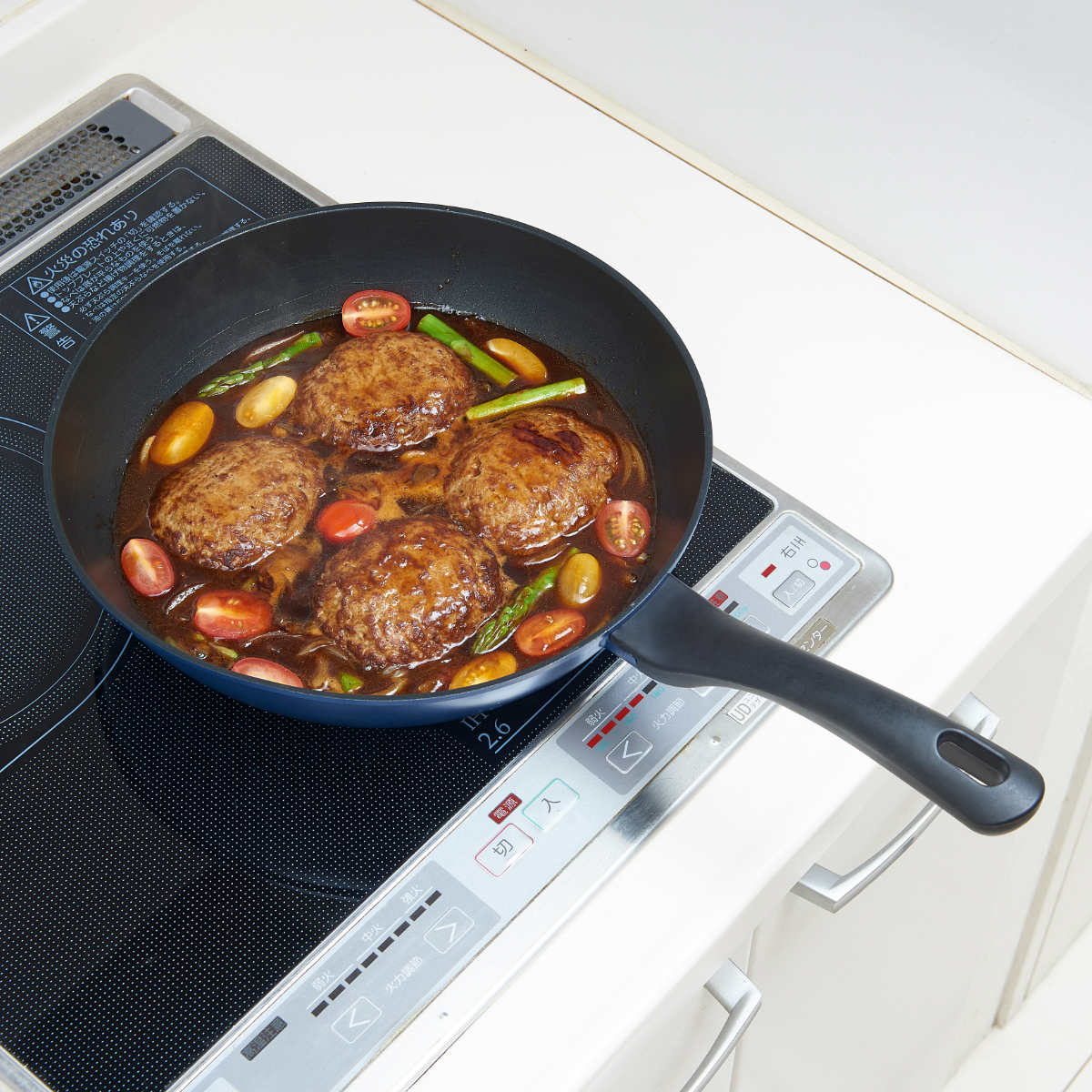 人工ダイヤモンド配合ふっ素コートとアルミニウム合金の内面2層・外面2層の多層コートのフライパンです。焦げ付きにくく、少ない油でヘルシーに調理できます。耐摩耗テスト50万回をクリアした、優れた耐久性を備えています。