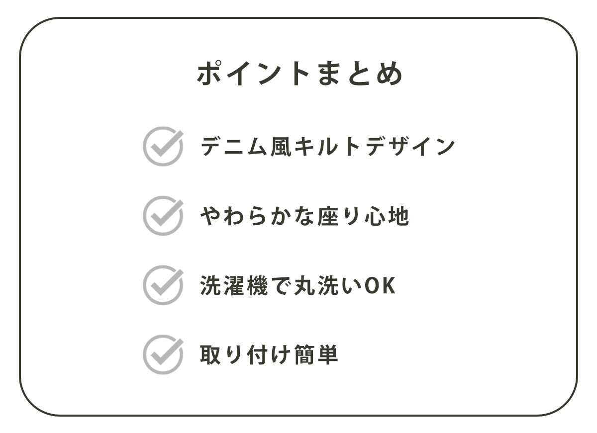 爽やかなデニム風生地にキルト加工を施した便座シートです。やさしい風合いと程よいカジュアル感で、ナチュラルなトイレ空間にもよくなじみ、すっきりとおしゃれな雰囲気を演出します。