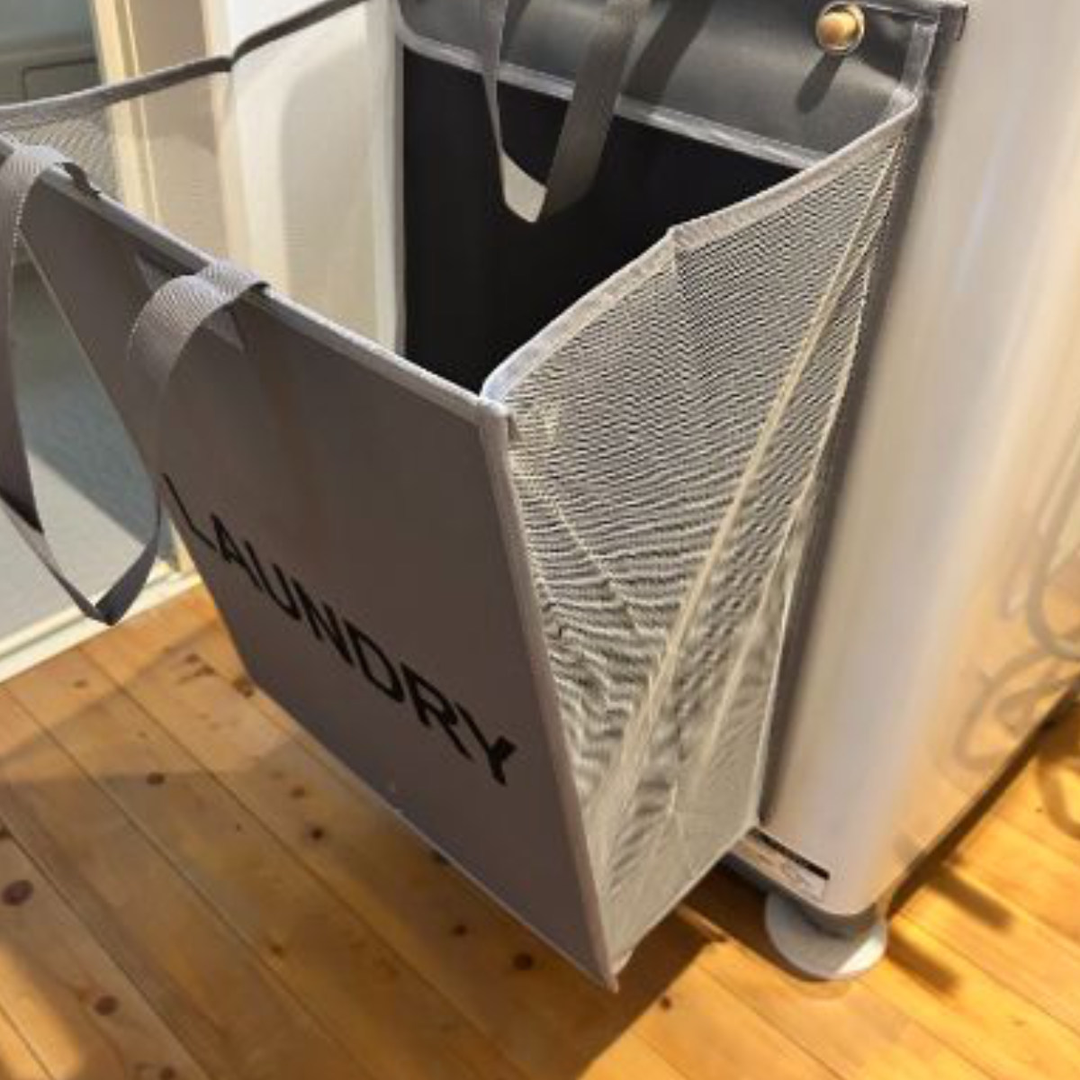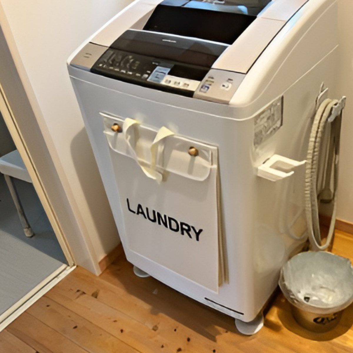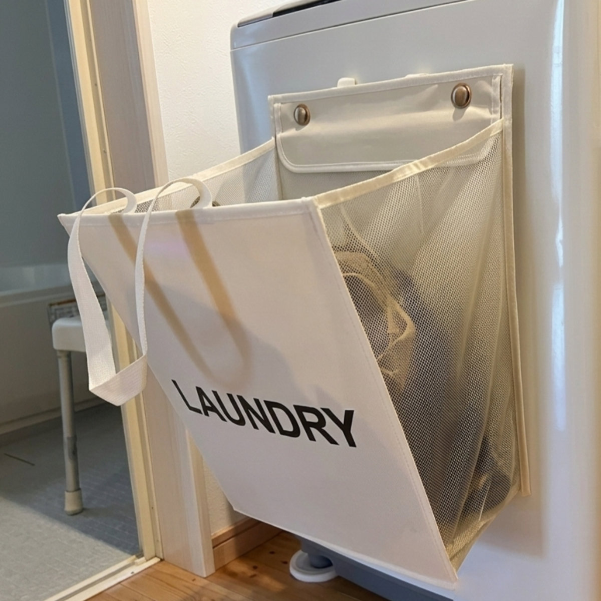 洗濯機横や壁に掛けて使用できる、省スペース設計のランドリーバッグです。付属の木製フック+粘着シールで、取り付けもカンタン。洗濯物を入れたまま「掛けておける」ので、床置きのカゴよりスペースを取りません。
