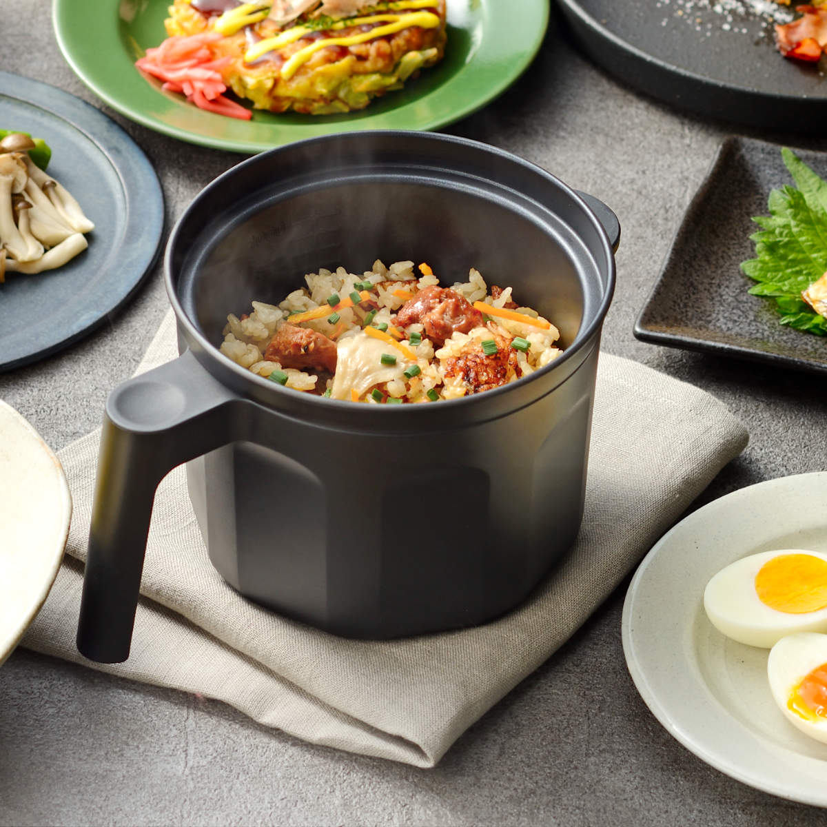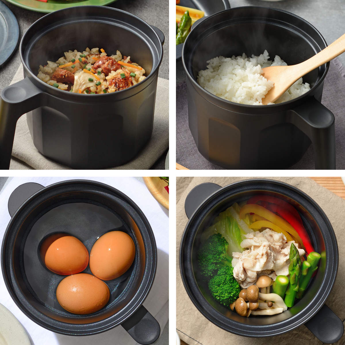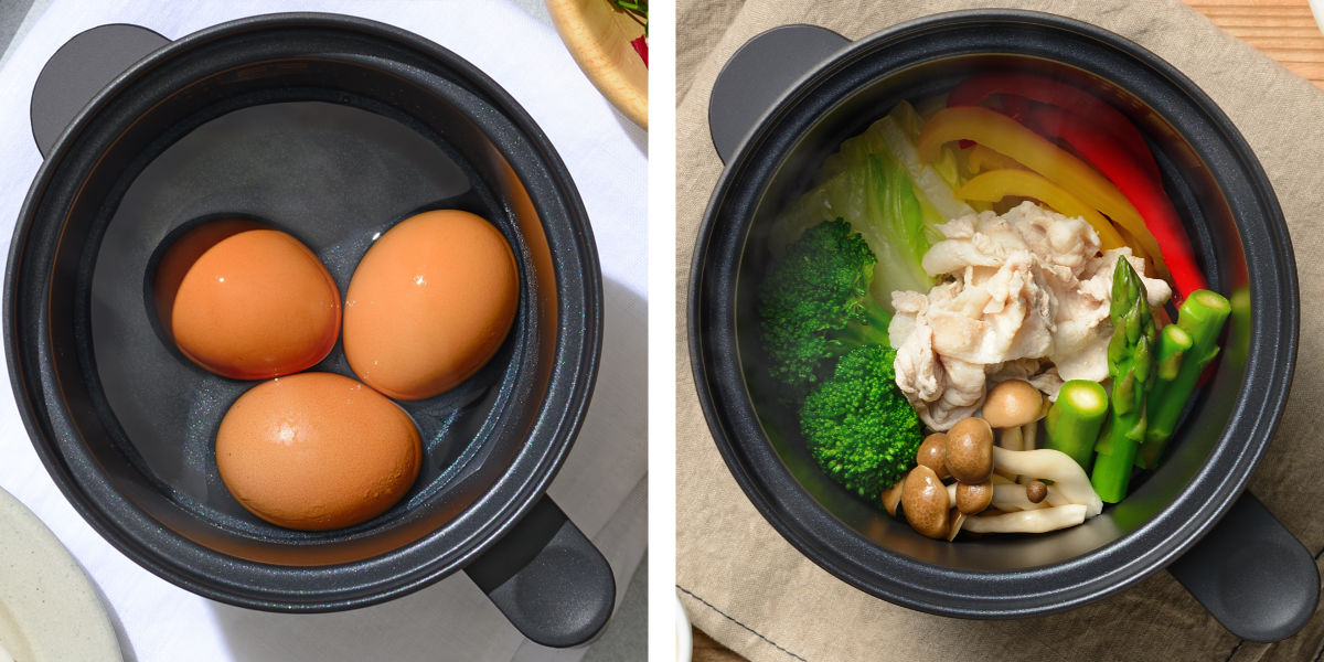 深さのあるポット型なので、ゆで卵や蒸し野菜などの調理に便利です。炊き込みご飯では、香ばしいカリカリのおこげも楽しめます。