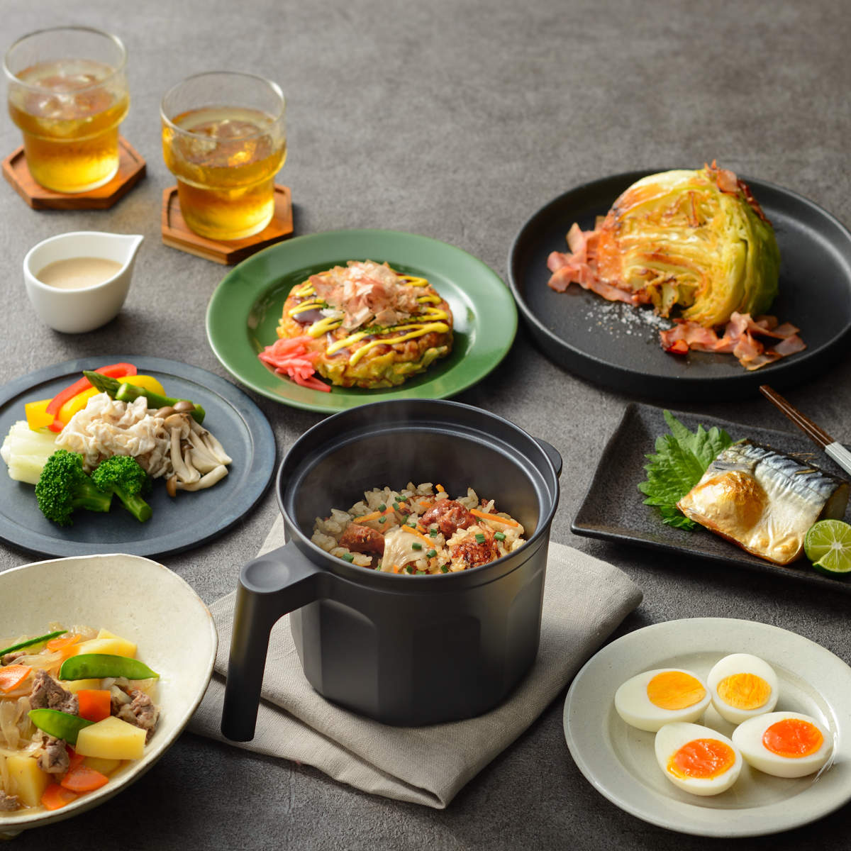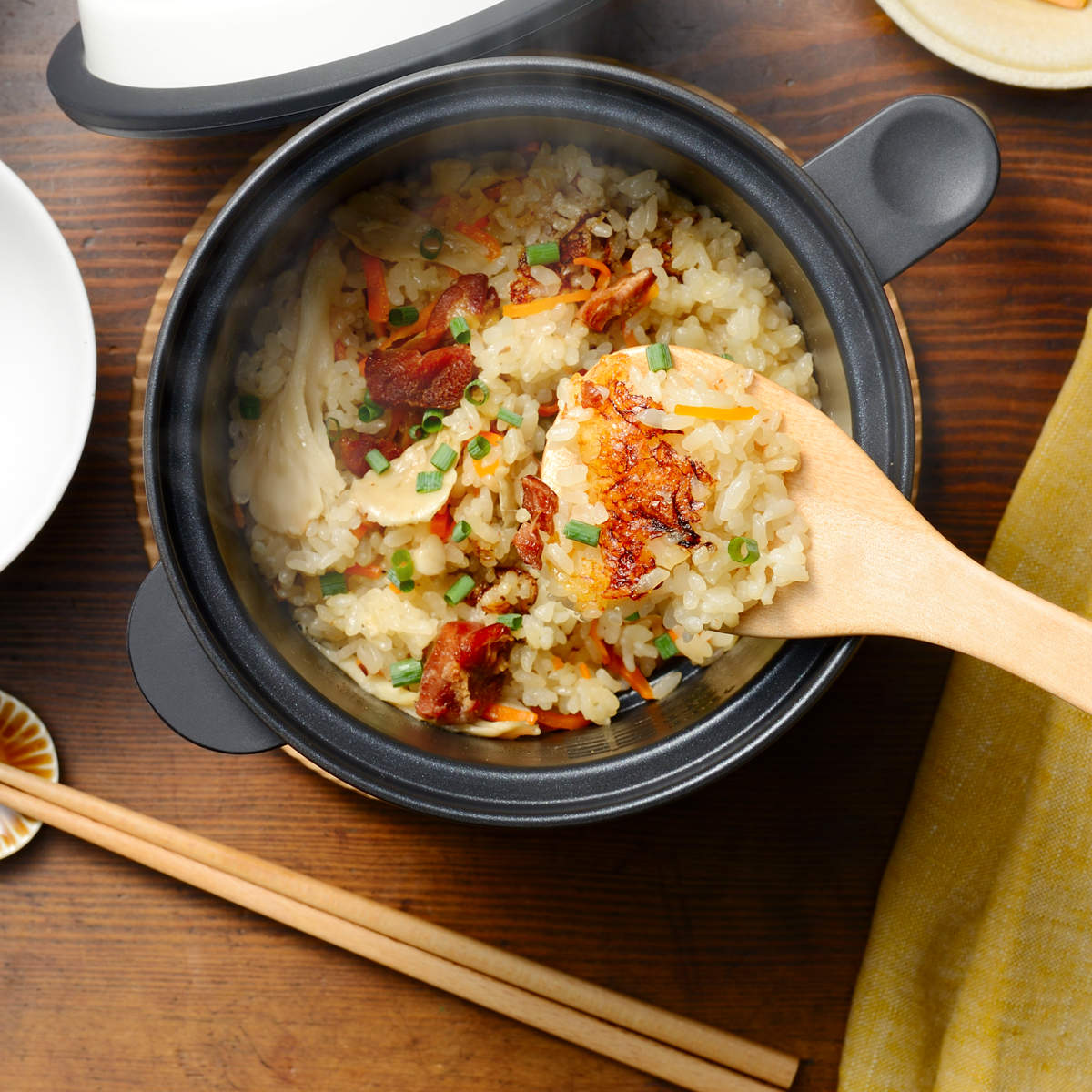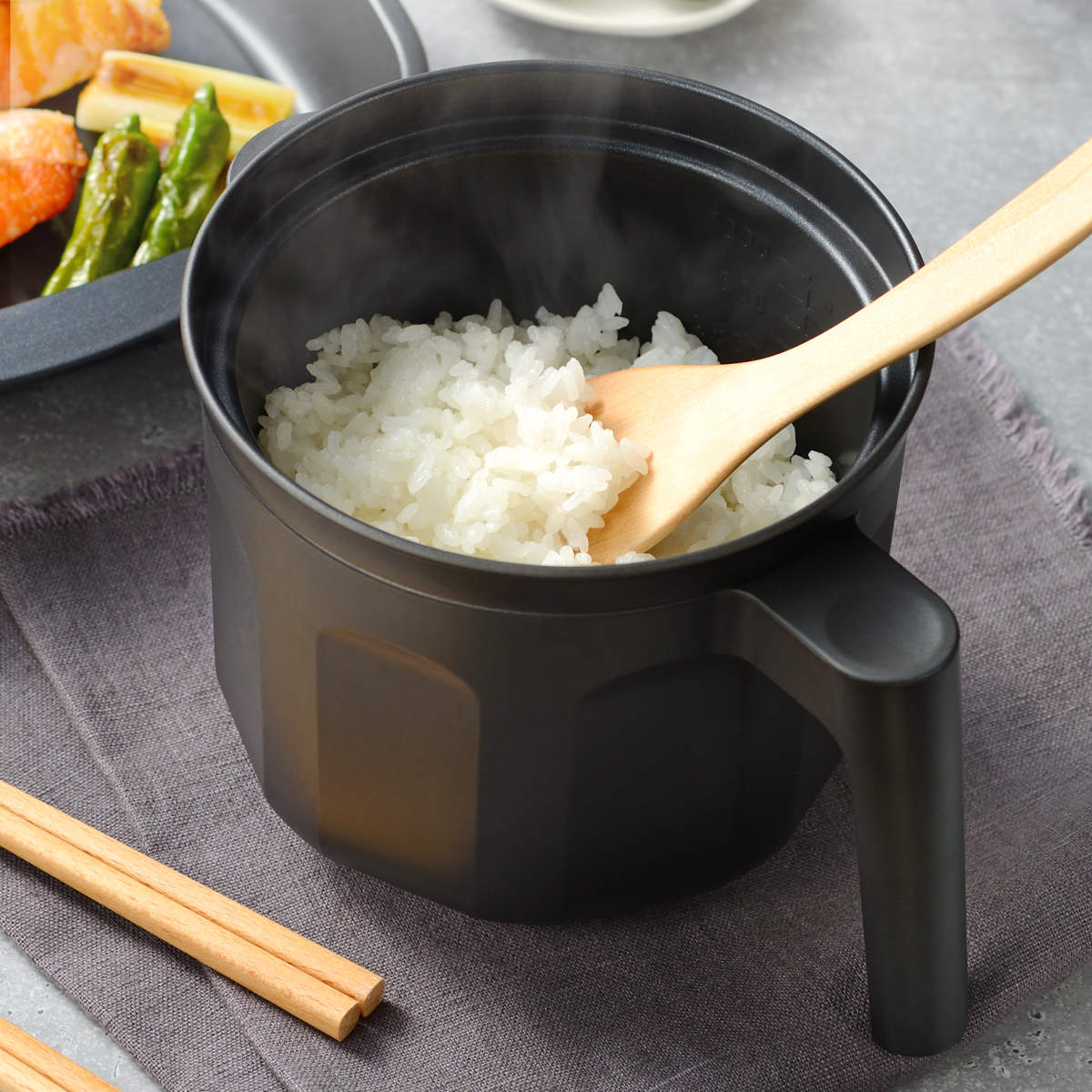 深さのあるポット型なので、ゆで卵や蒸し野菜などの調理に便利です。炊き込みご飯では、香ばしいカリカリのおこげも楽しめます。