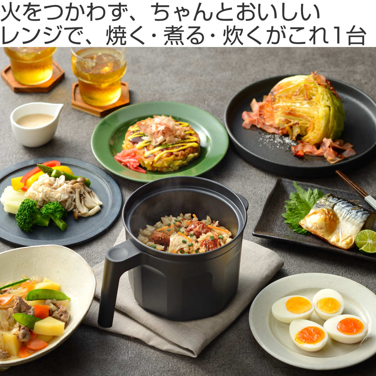 電子レンジに入れるだけで、「炊く・茹でる・蒸す・炒める・焼く・煮る・沸かす」と、この1台で7通りの調理ができる便利なマルチポットです。レシピ付きで調理に迷わず、毎日の献立の幅が広がります。忙しい毎日にうれしいポイントです。