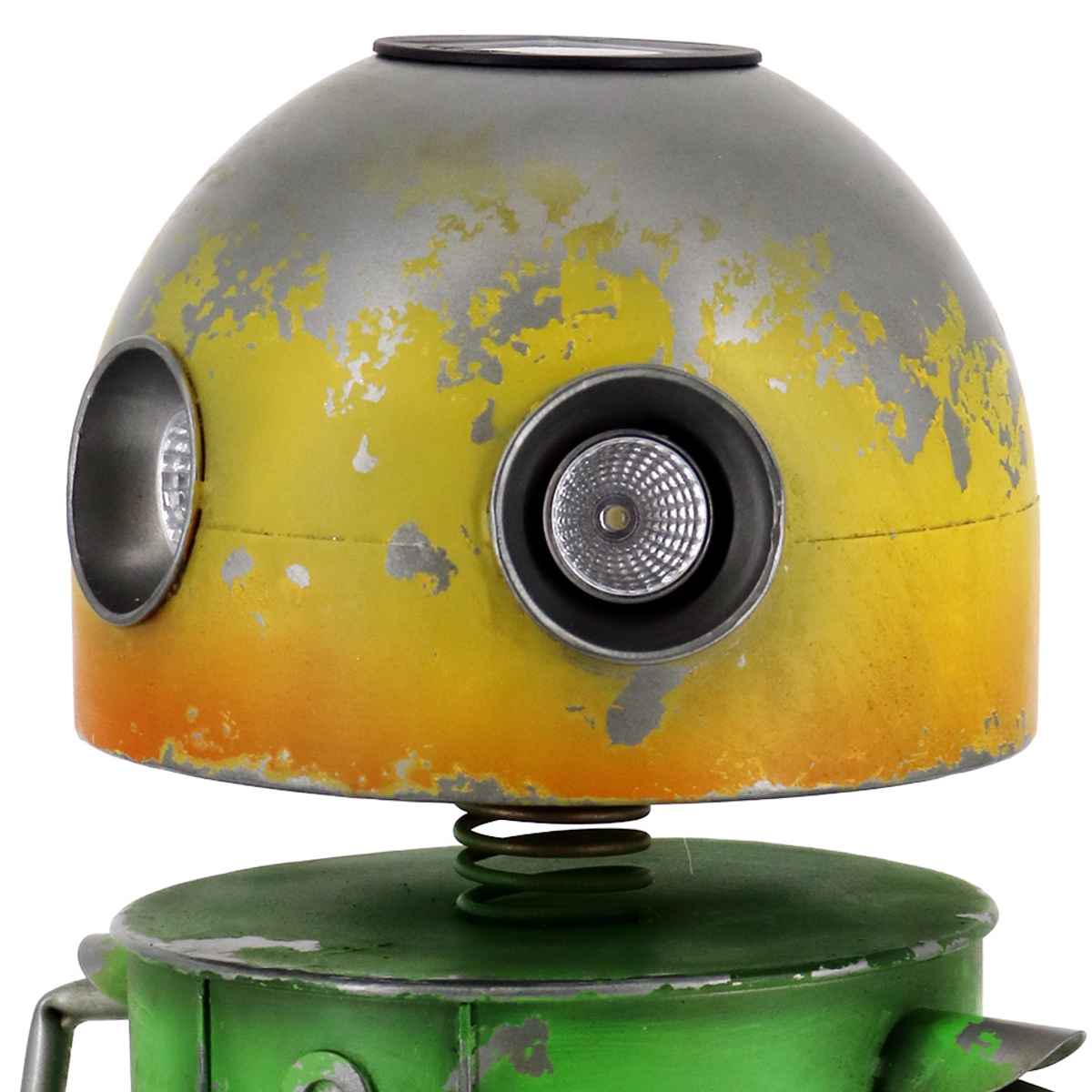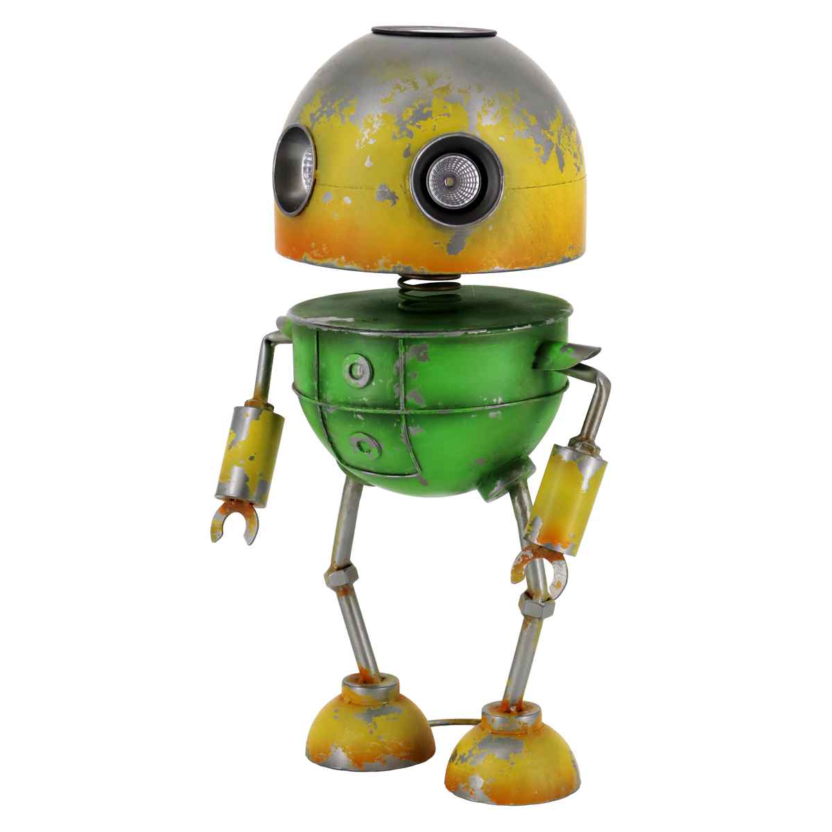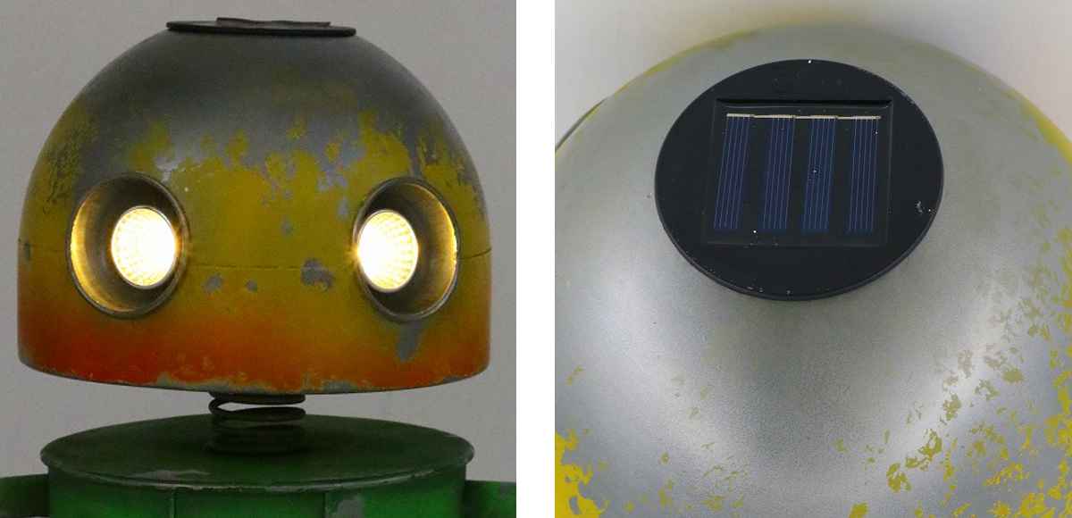 頭上にソーラーライトが付いていて、暗くなるとロボットの目が点灯します。昼と夜で異なる表情を楽しめます。