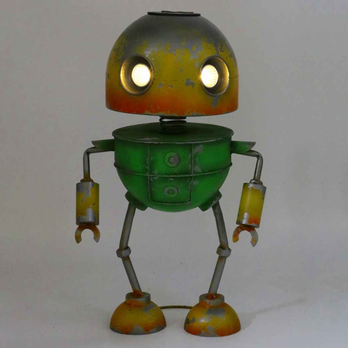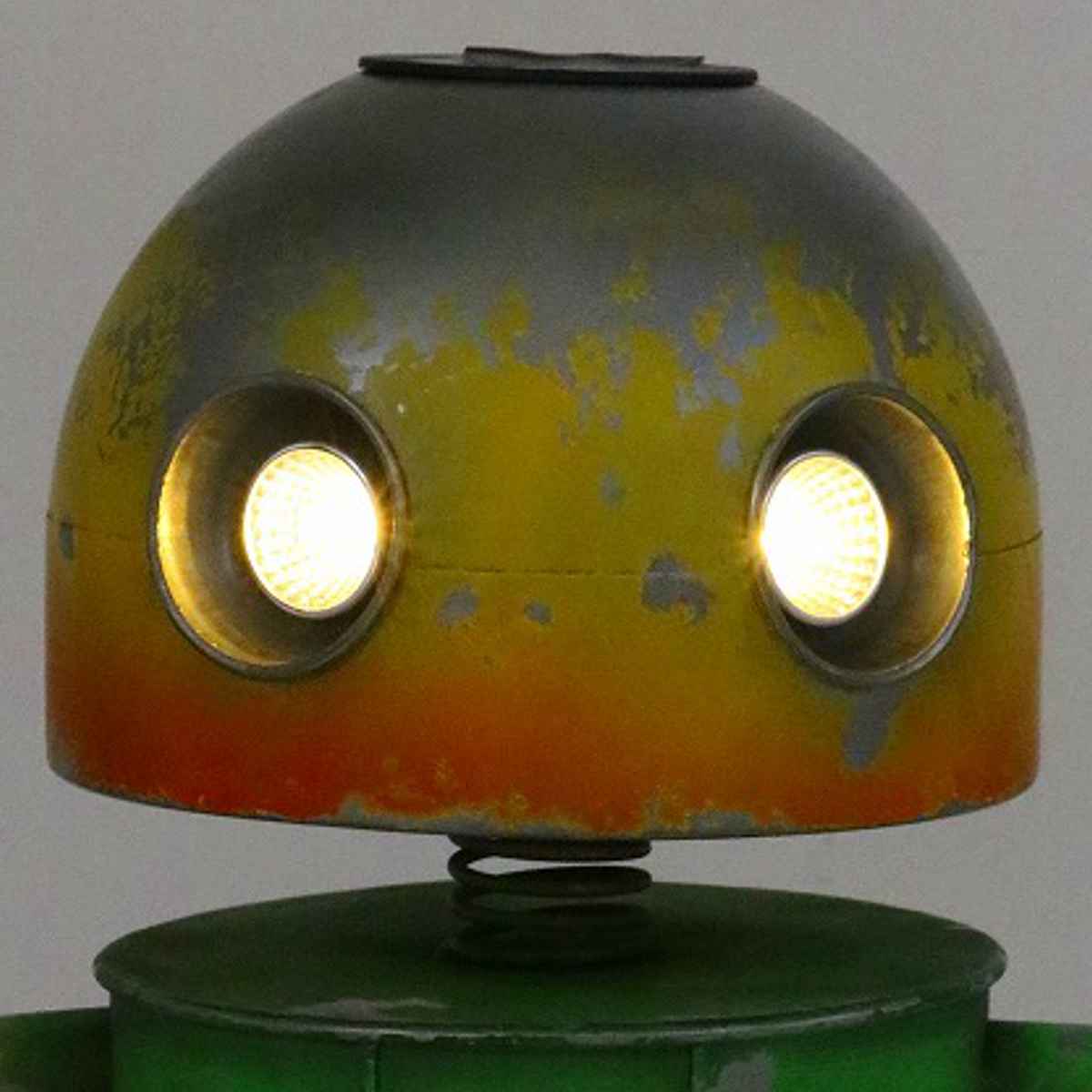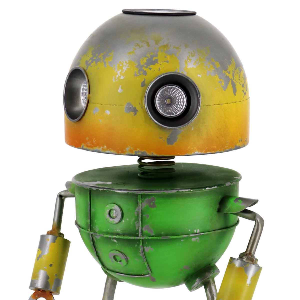 頭上にソーラーライトが付いていて、暗くなるとロボットの目が点灯します。昼と夜で異なる表情を楽しめます。
