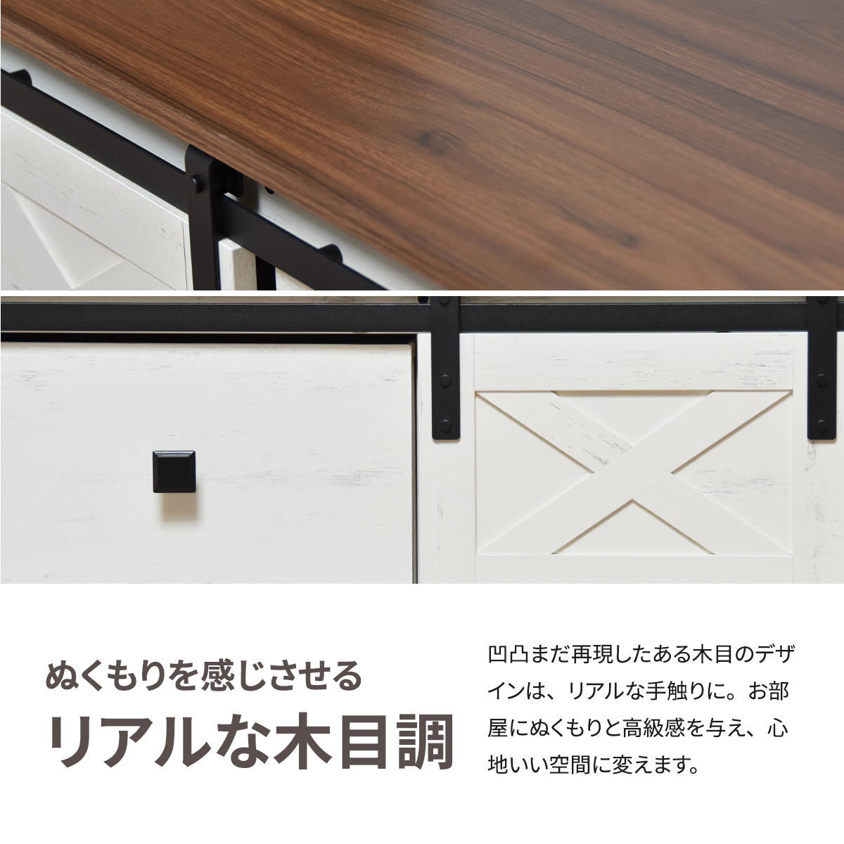軽い力でスムーズに開閉ができるスライド扉は、ブラックスチールとホワイト木目のコントラストがアクセントになっています。