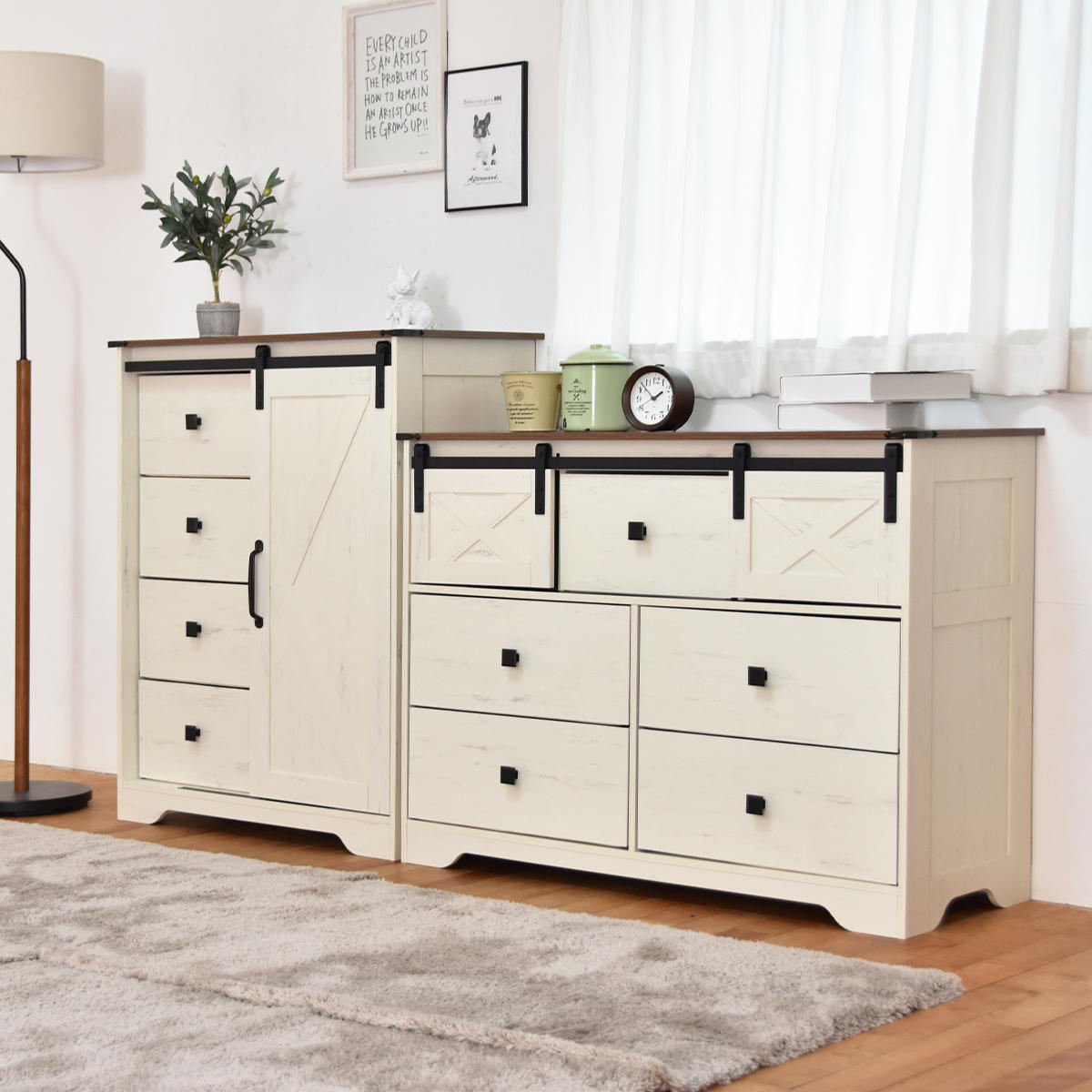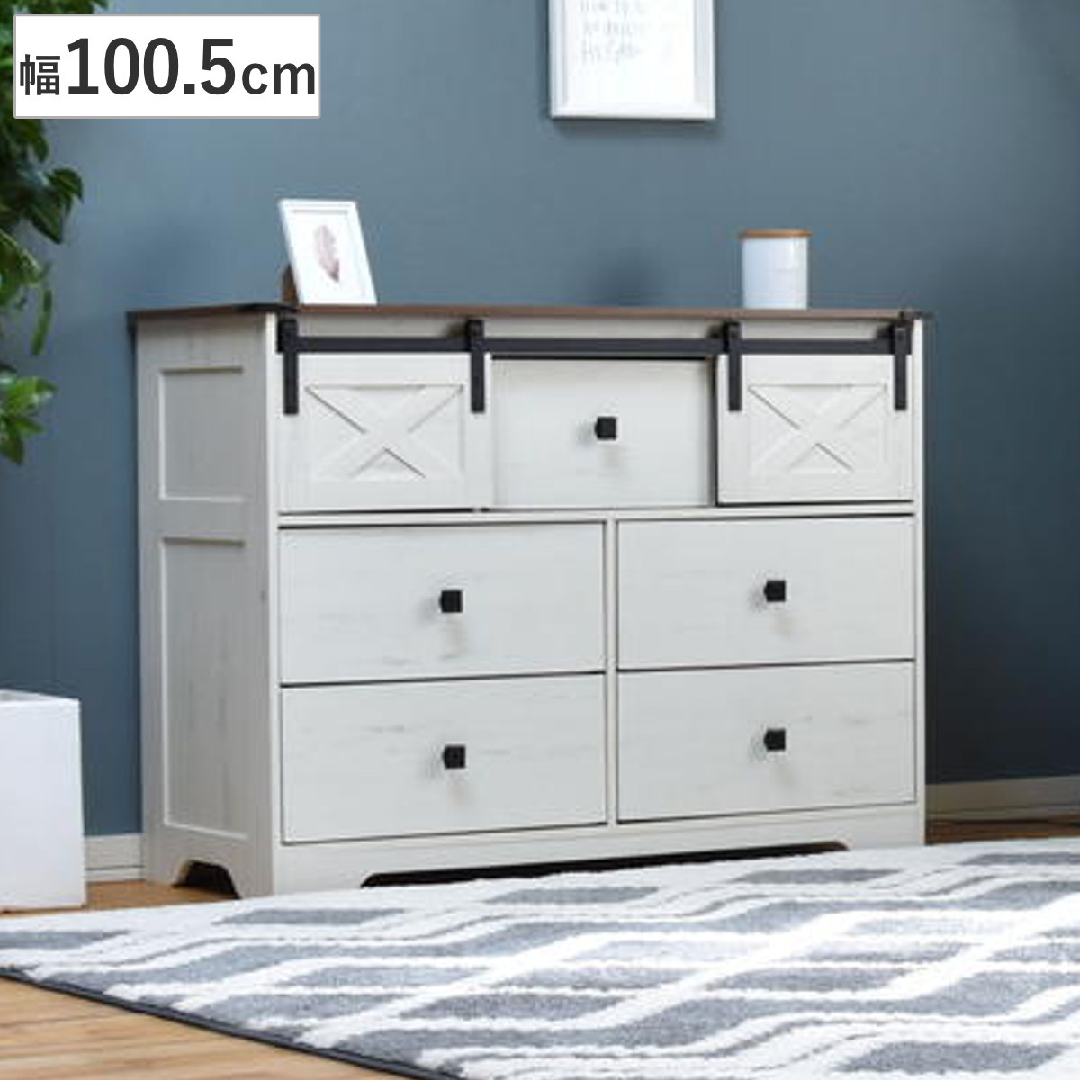ナチュラルで落ち着いた雰囲気の中に、どこか懐かしさや安心感を感じられるファームハウススタイルのチェストです。扉で隠す収納棚と引き出し収納を備え、生活感を抑えた美しい空間を演出します。
