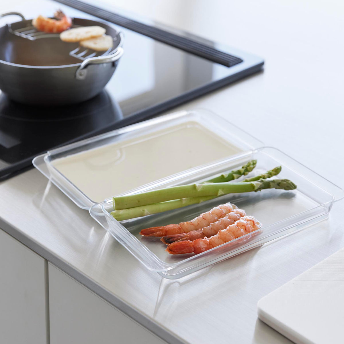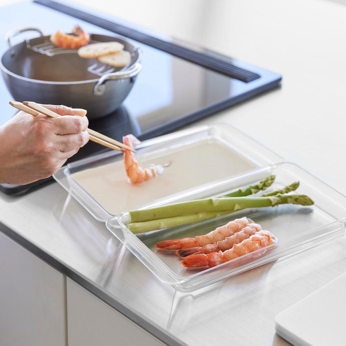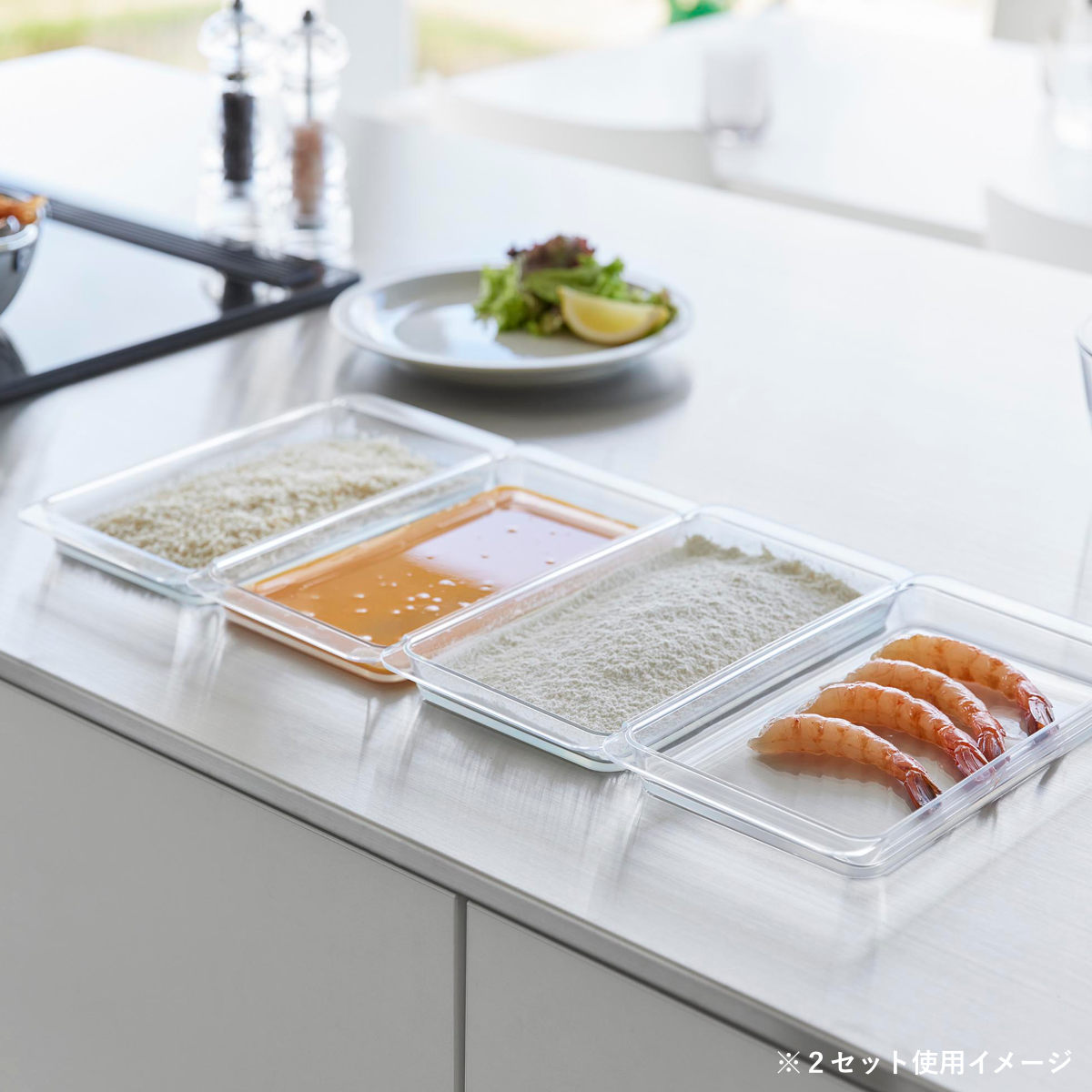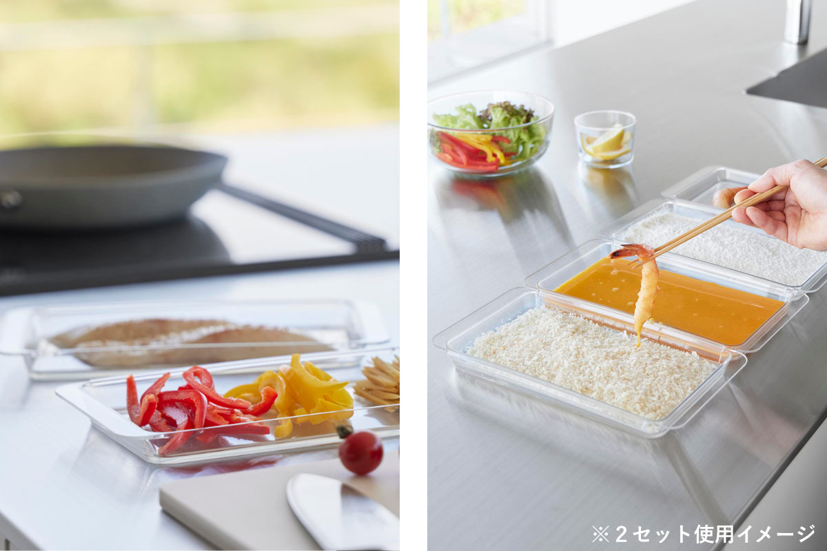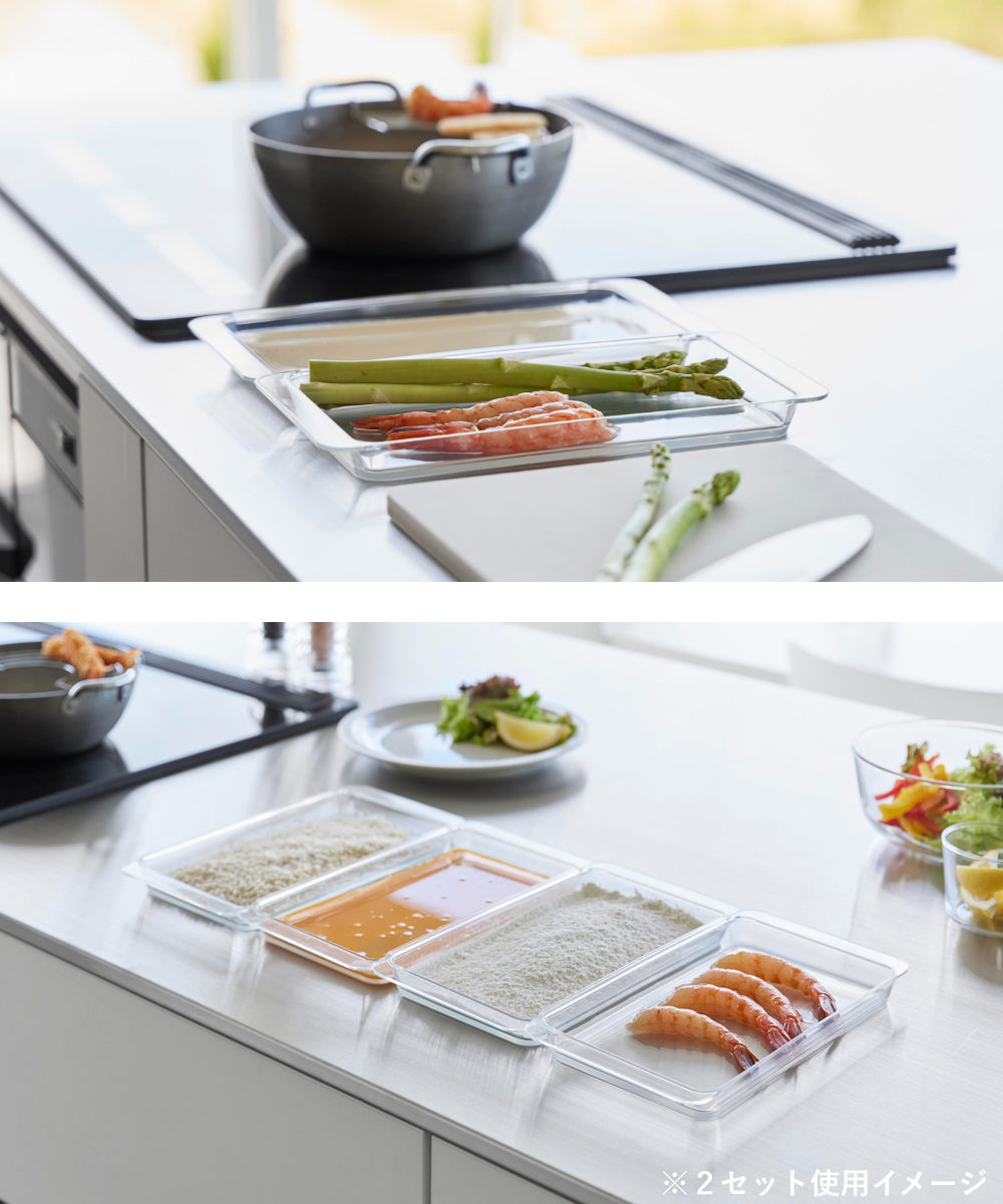 2個連結させて使用すると揚げ物の衣付けもスムーズにできて、調理台を汚さずに食材を移せます。
