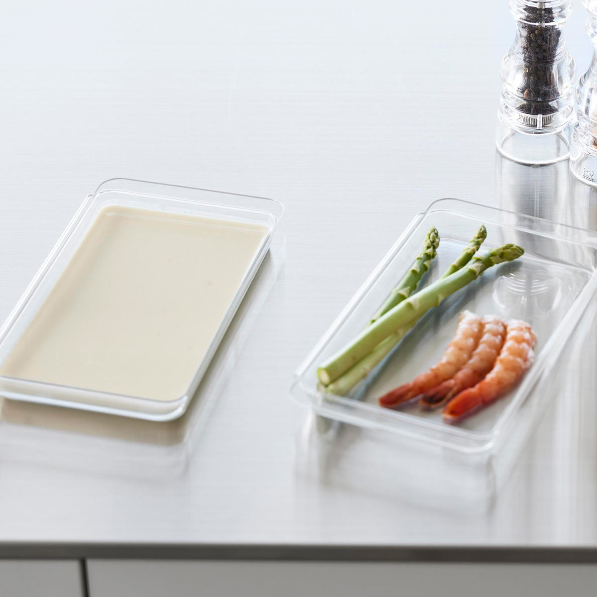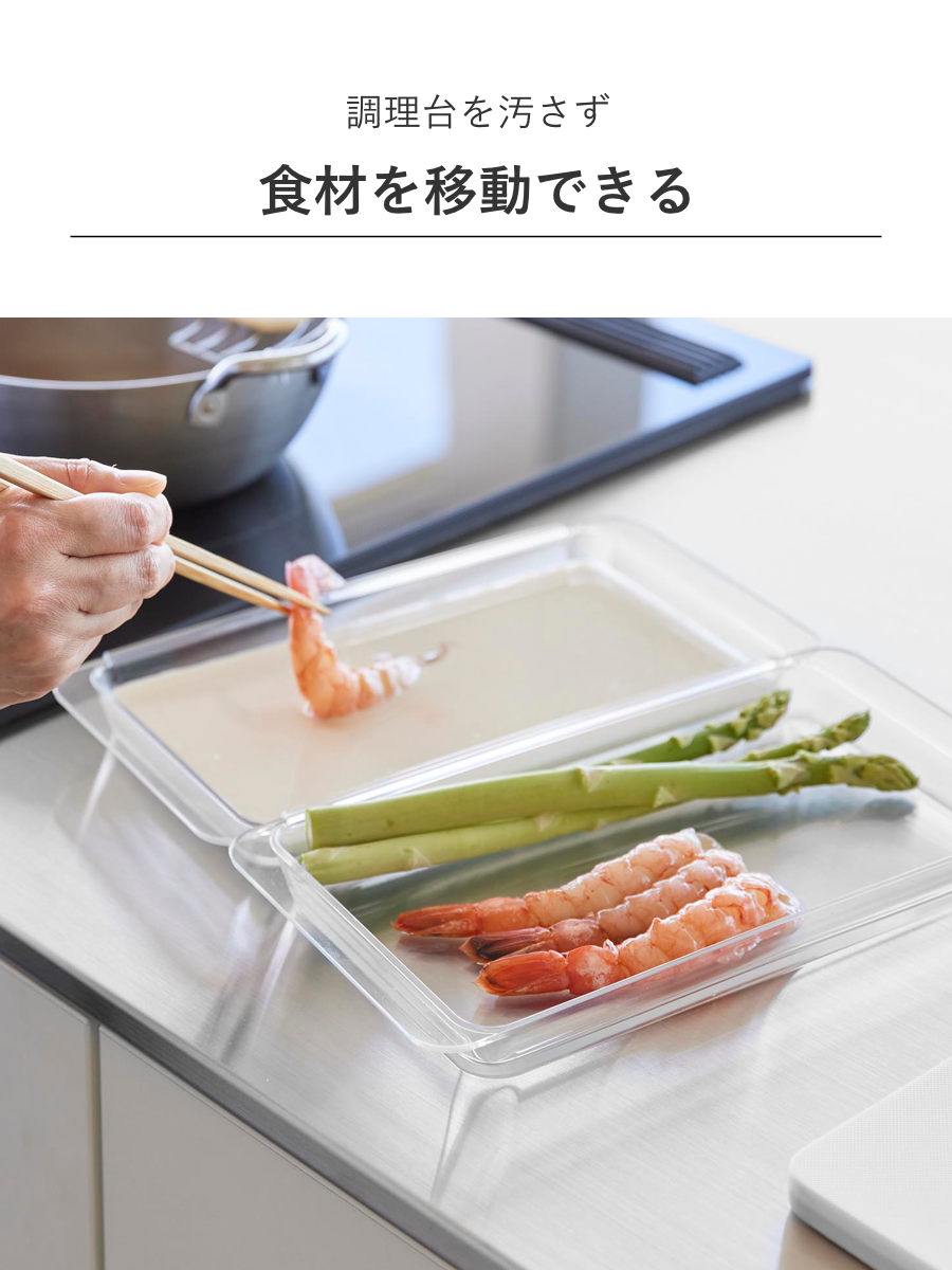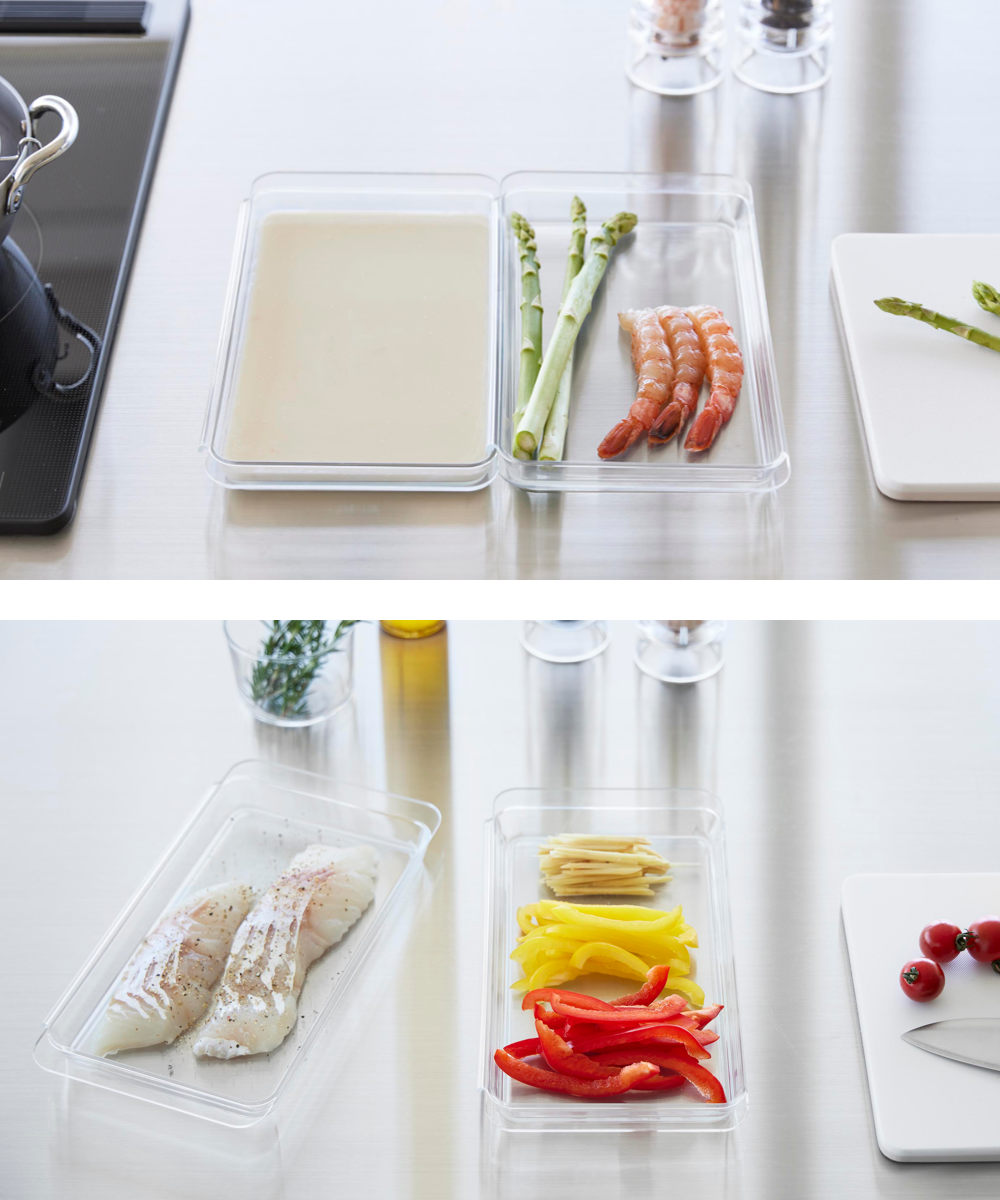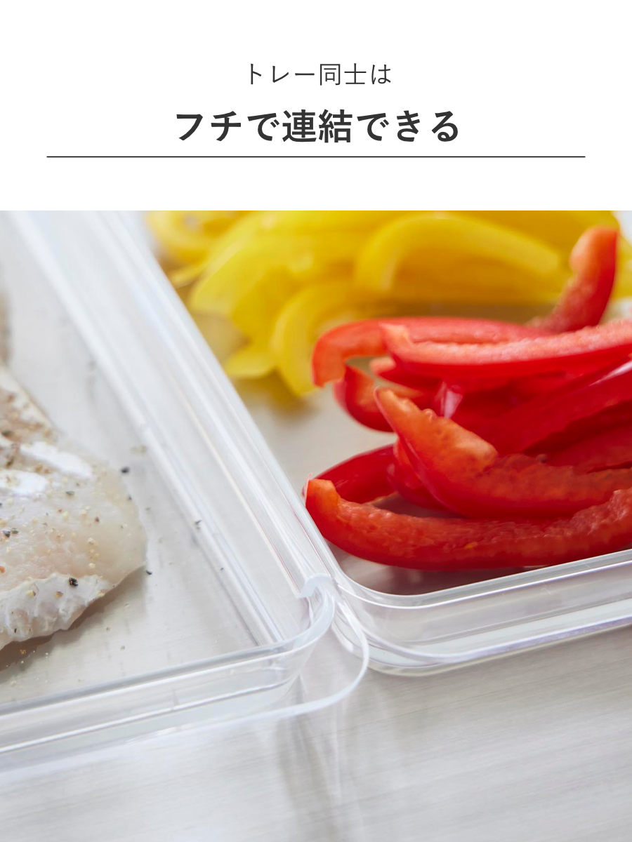 連結ができて便利な浅型の調理トレー2個組です。食材の色移りがしにくく、使いやすい透明のデザインです。カットした野菜、下味を付けたお肉やお魚を入れて料理の下準備に便利に使えます。