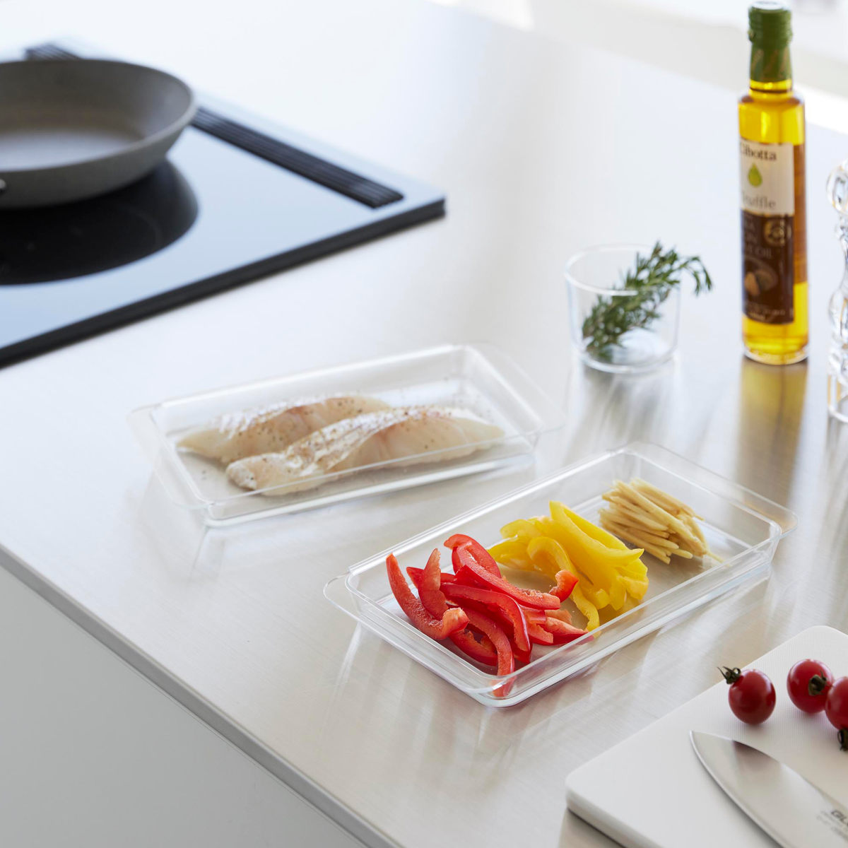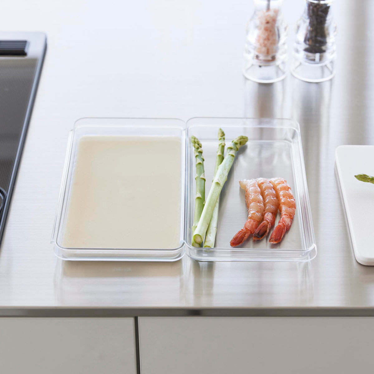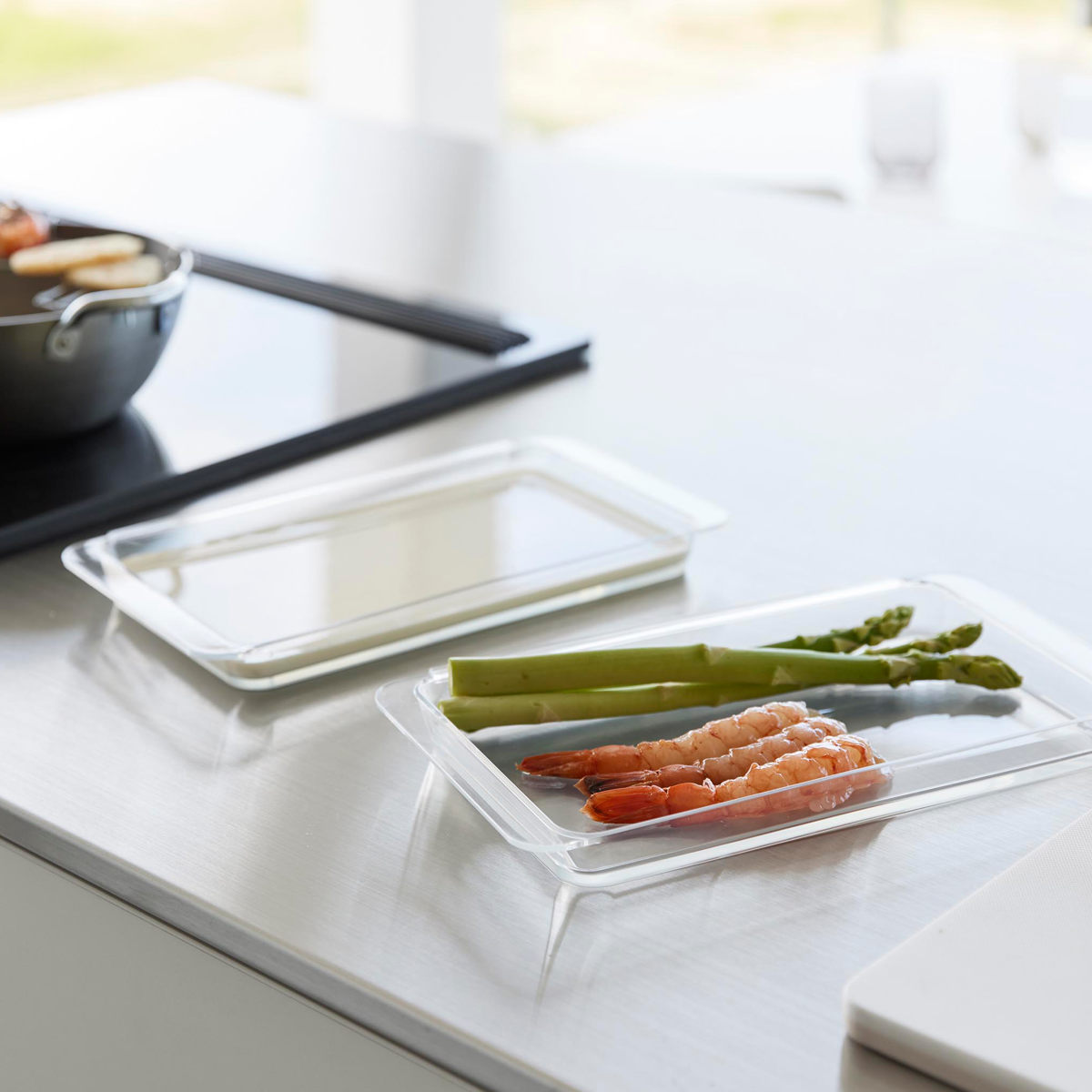 連結ができて便利な浅型の調理トレー2個組です。食材の色移りがしにくく、使いやすい透明のデザインです。カットした野菜、下味を付けたお肉やお魚を入れて料理の下準備に便利に使えます。
