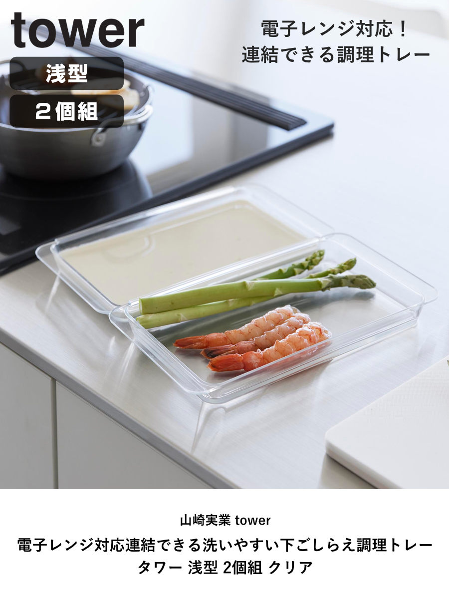 山崎実業 tower 電子レンジ対応連結できる洗いやすい下ごしらえ調理トレー タワー 浅型 2個組 クリア ( 4903208103367 タワーシリーズ 調理トレー 連結可能 2個 食洗機対応 電子レンジ対応 )
