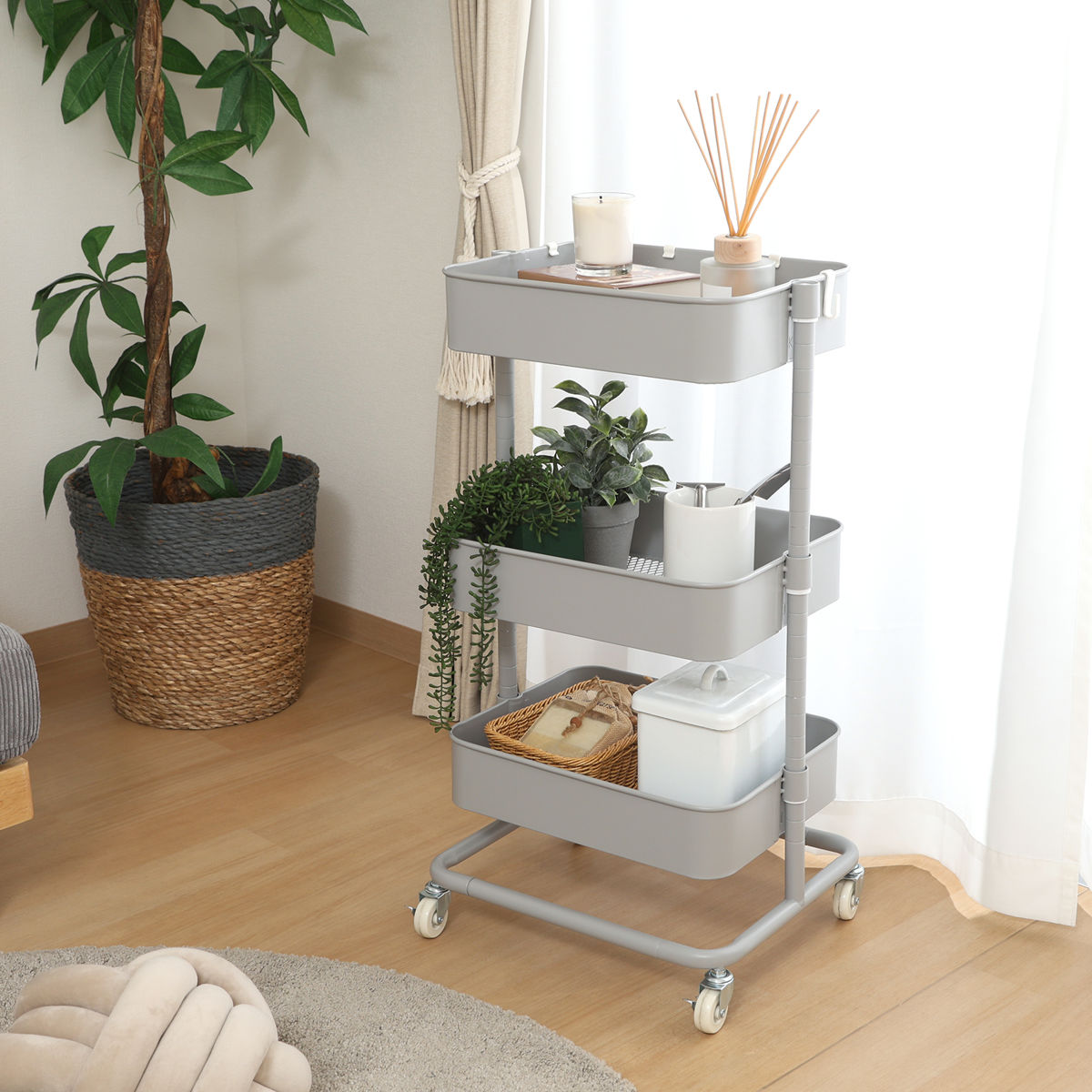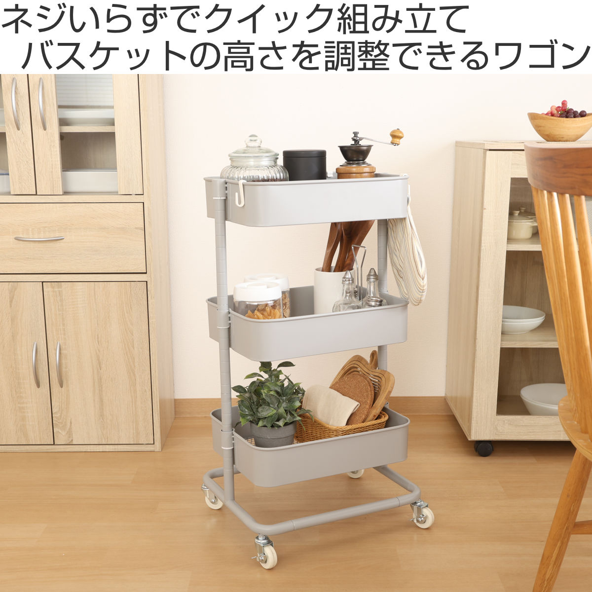 バスケットはお好みの位置に取り付けることができるので、収納する物や使い方に合わせて調整できます。