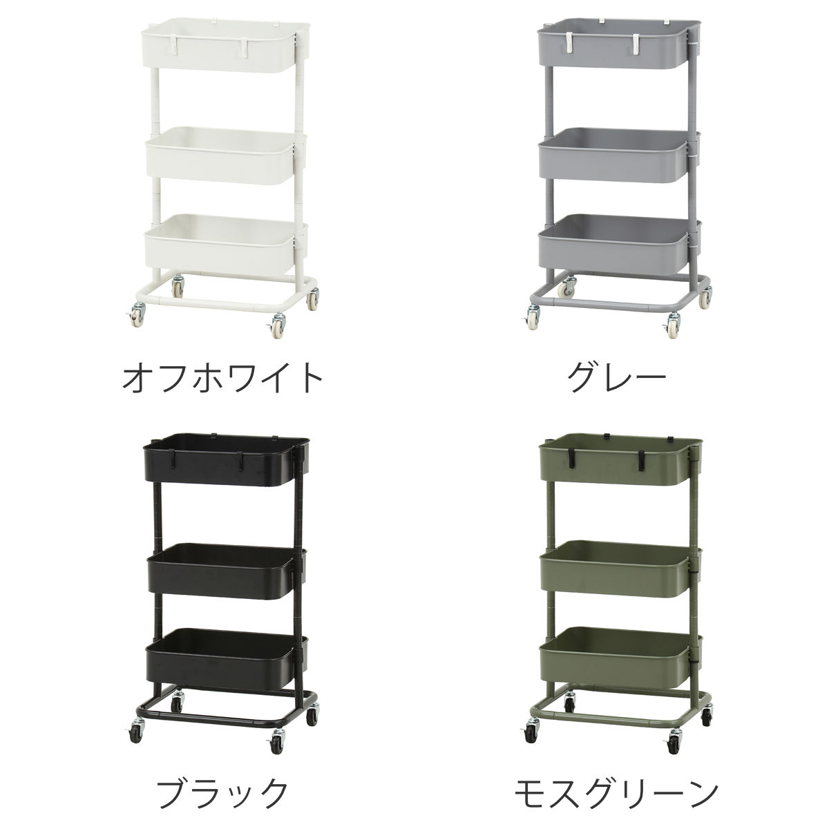 シンプルなデザインで使いやすいキッチンワゴンです。調味料やストック用品などの収納に便利で、キッチンまわりをすっきり整理できます。インテリアやお部屋の雰囲気に合わせて選べる4色展開です。