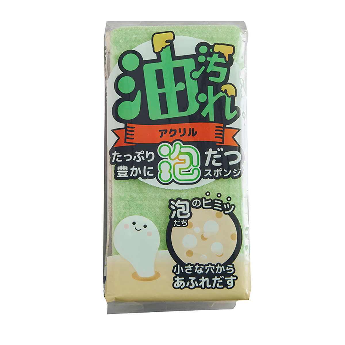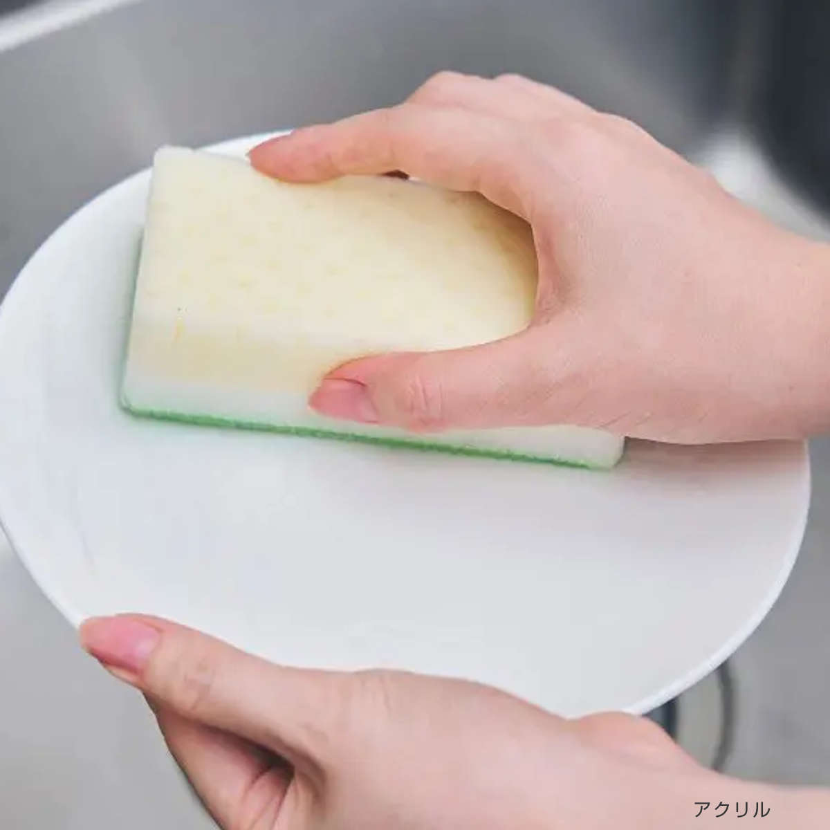 油汚れに強いアクリル素材で、水だけでもベタつきやヌルつきをしっかりキャッチします。フライパンの油膜や調理後のこびりつき汚れも落としやすく、洗剤を使う量を減らせるのも魅力です。