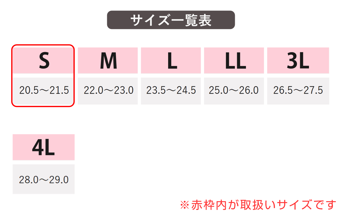 ![]() S(20.5~21.5cm) 【▲このページの商品】 | ![]() M(22.0~23.0cm) | ![]() L(23.5~24.5cm) |
