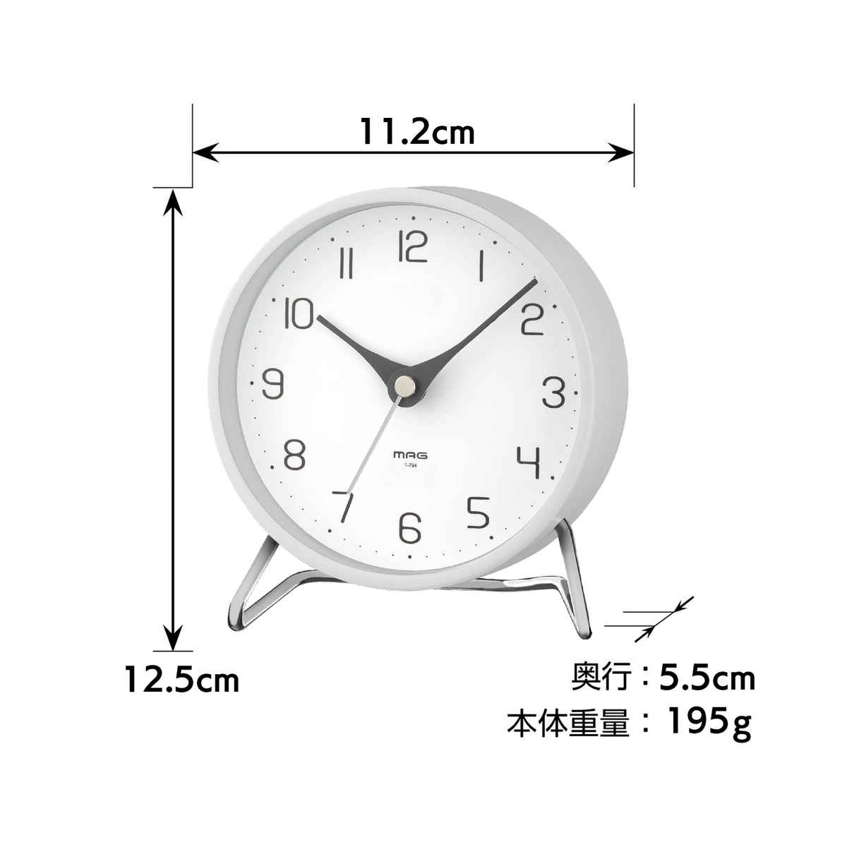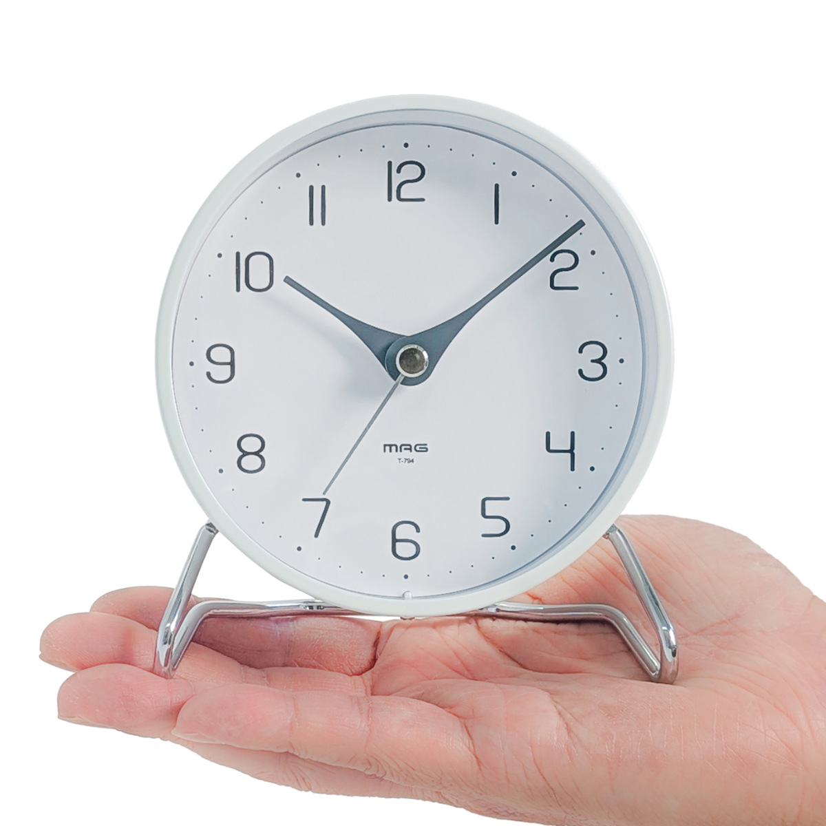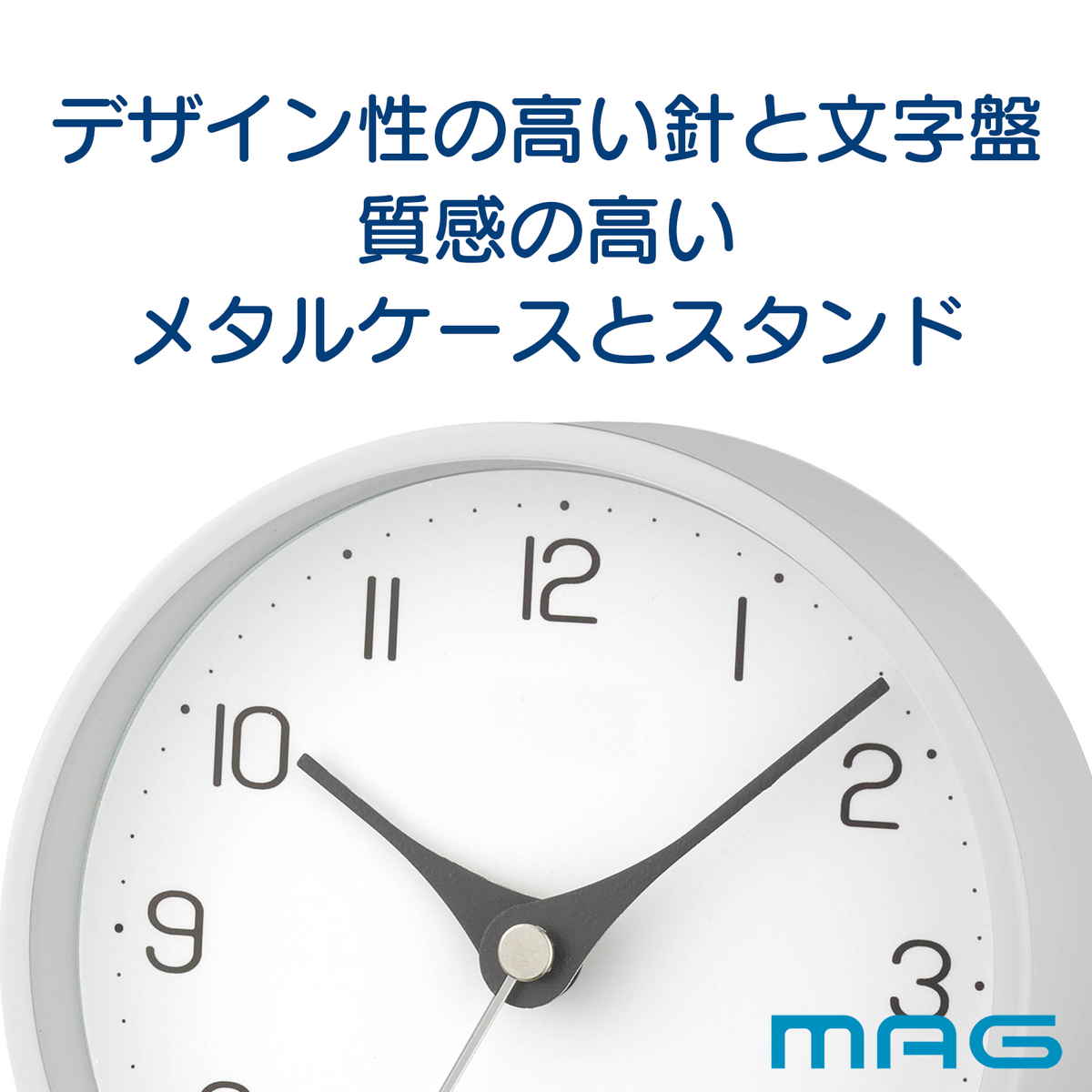 特徴的な針の形や文字盤など、シンプルながら細部のデザインにこだわったミニマルな置き時計です。本体とスタンドにはメタル素材を使用し、スタイリッシュな印象に。インテリアに溶け込みつつ存在感を放ちます。