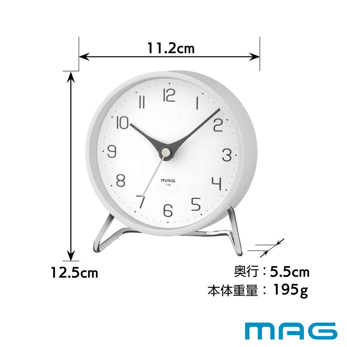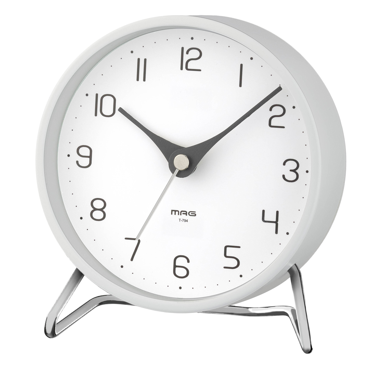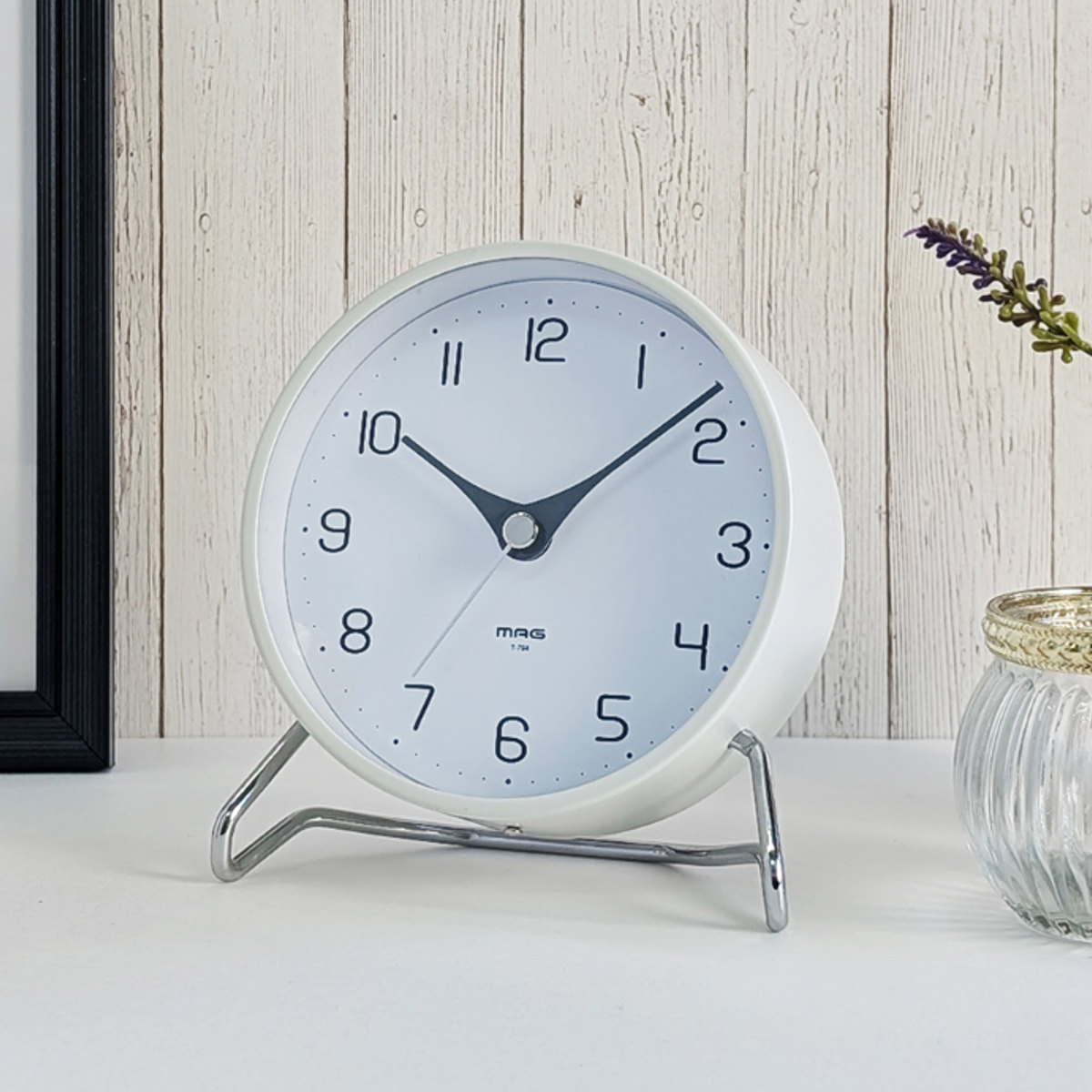 特徴的な針の形や文字盤など、シンプルながら細部のデザインにこだわったミニマルな置き時計です。本体とスタンドにはメタル素材を使用し、スタイリッシュな印象に。インテリアに溶け込みつつ存在感を放ちます。