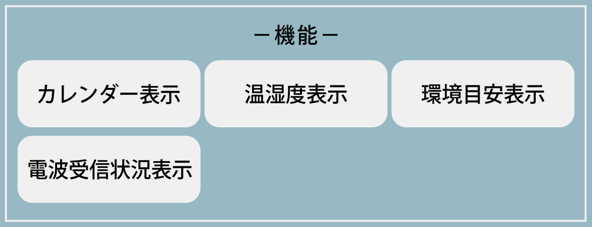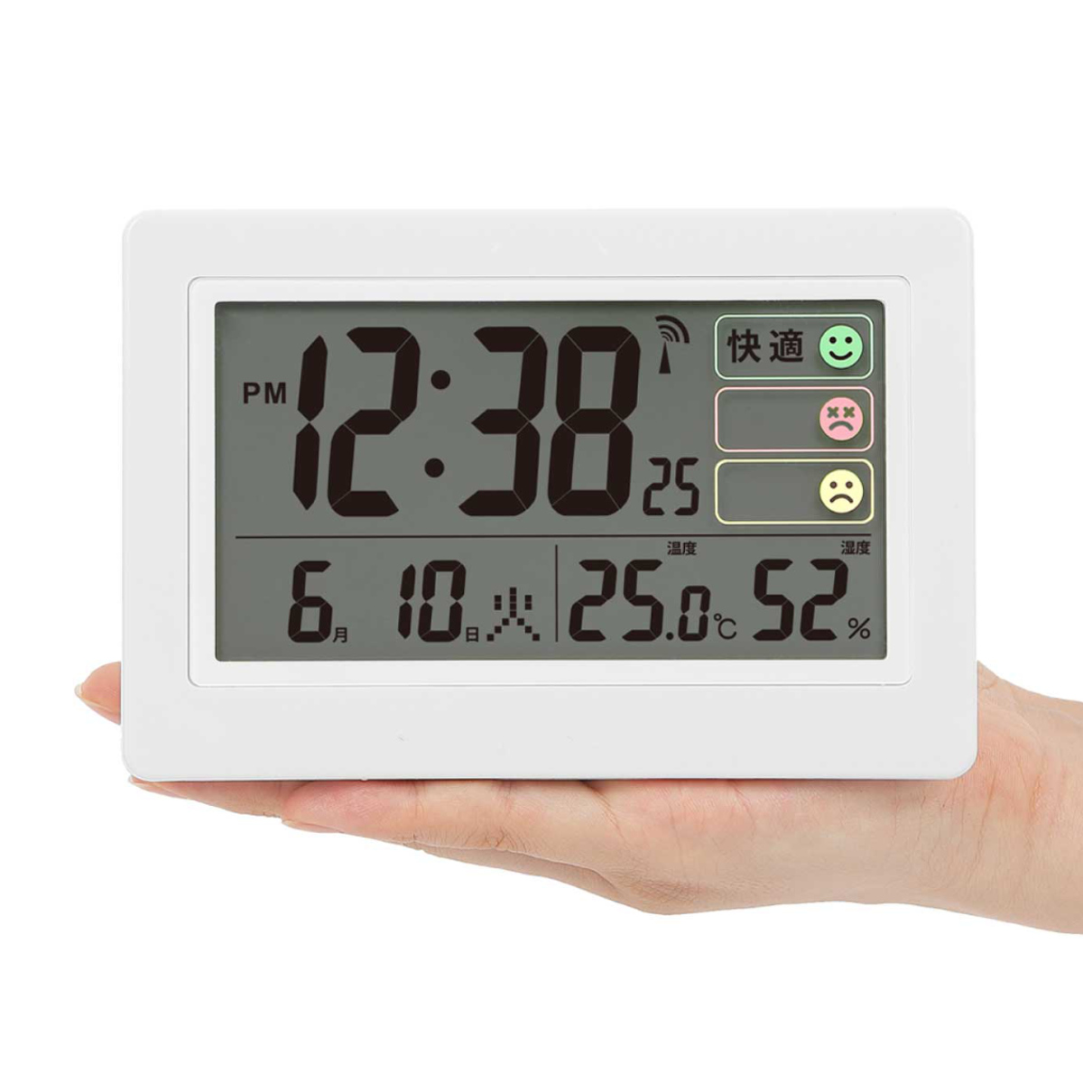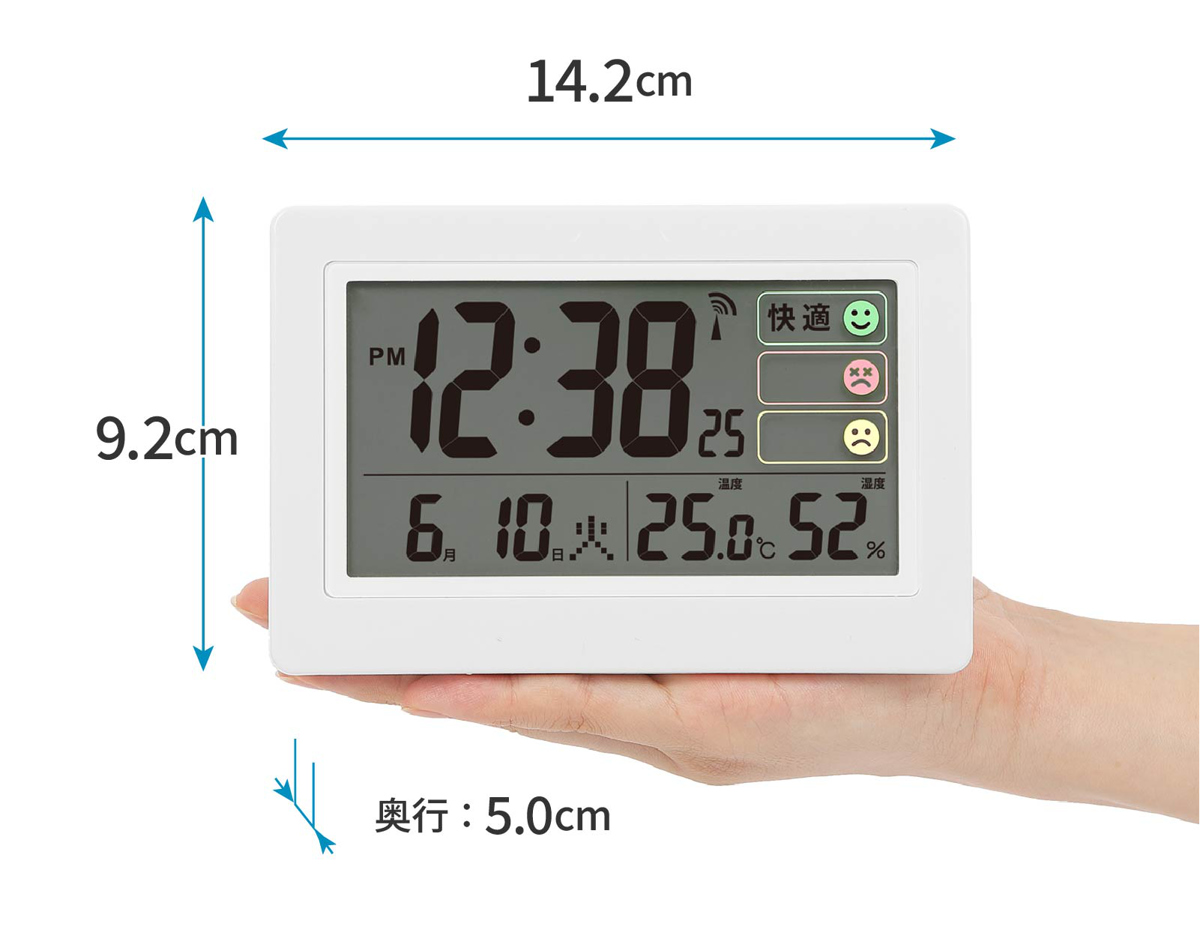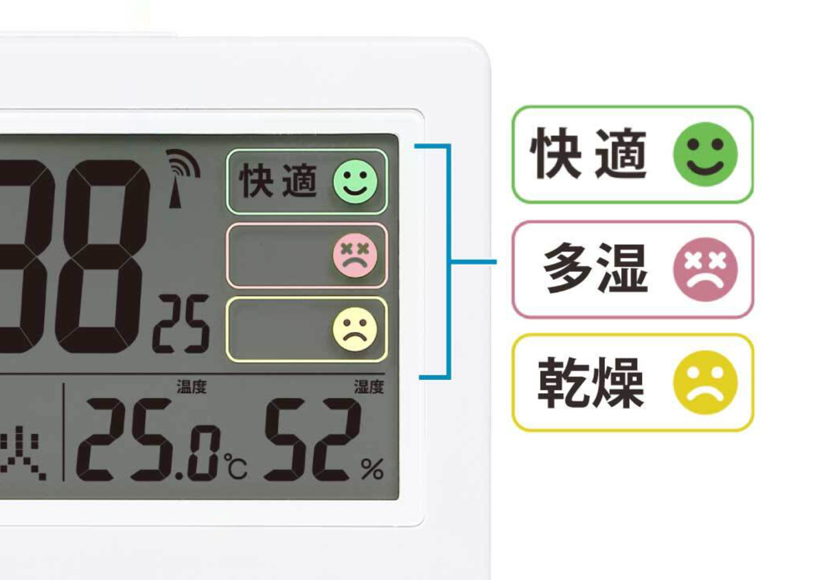 湿度の状態を「快適」「多湿」「乾燥」の3段階で表示します。色分けされた表情マークで今の室内環境がひと目で分かるので、エアコンや加湿・除湿のタイミング管理にも便利です。