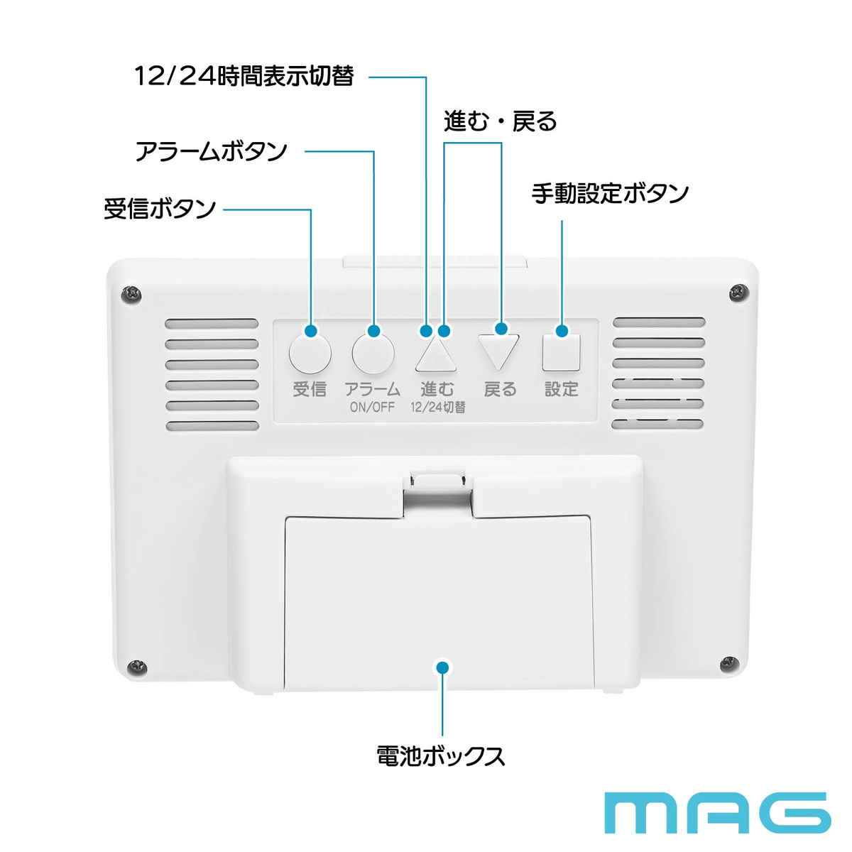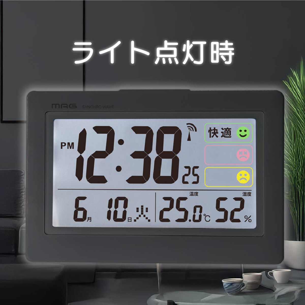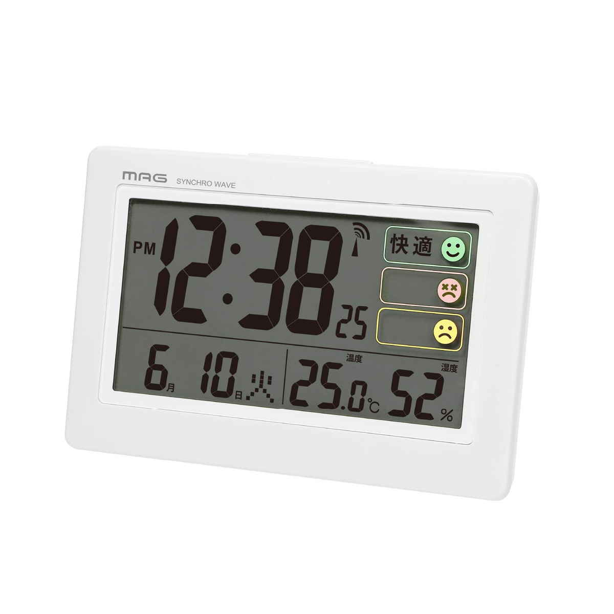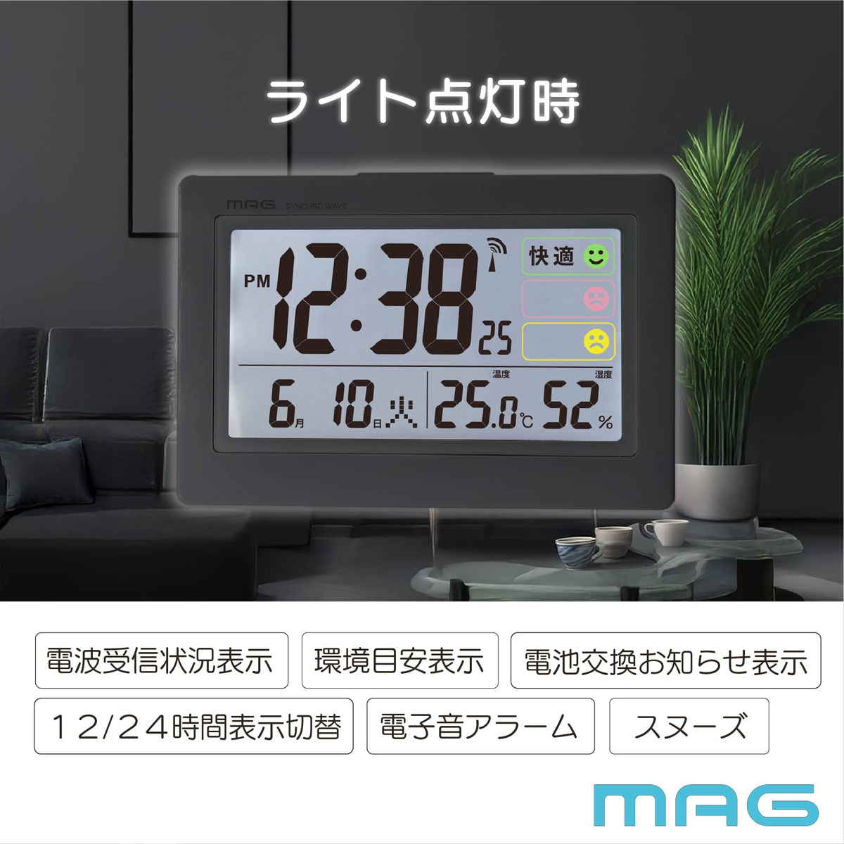 電波時計 デジタル 環境目安付き カレンダー付き 目覚まし時計 MAG ( 置き時計 目覚し時計 めざまし時計 アラームクロック 時計 ライト 電波 見やすい 文字盤大きい シンプル 寝室 ベッドサイド リビング 勉強机 アラーム )
