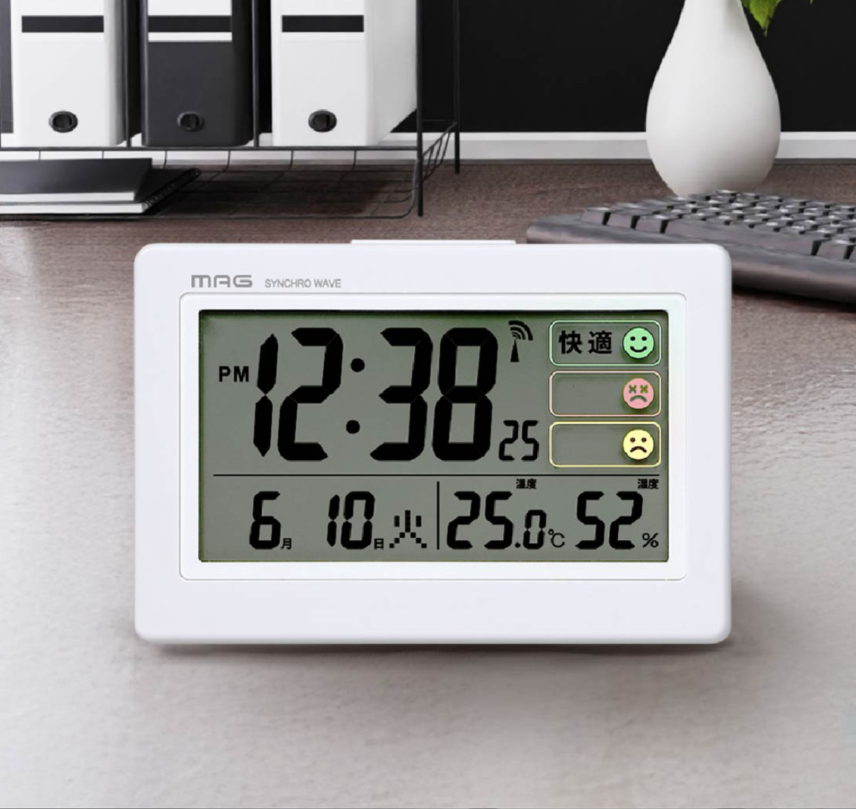 環境アイコンと大きな表示で見やすいデジタル電波時計