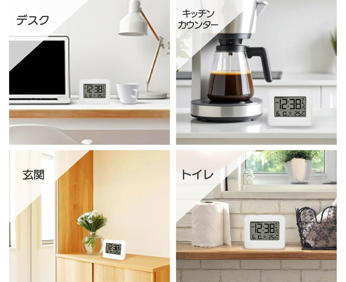 ●卓上にすっきり置けるコンパクトサイズながら、時刻・日付・温度・湿度を大きく表示する見やすいデジタル時計です。