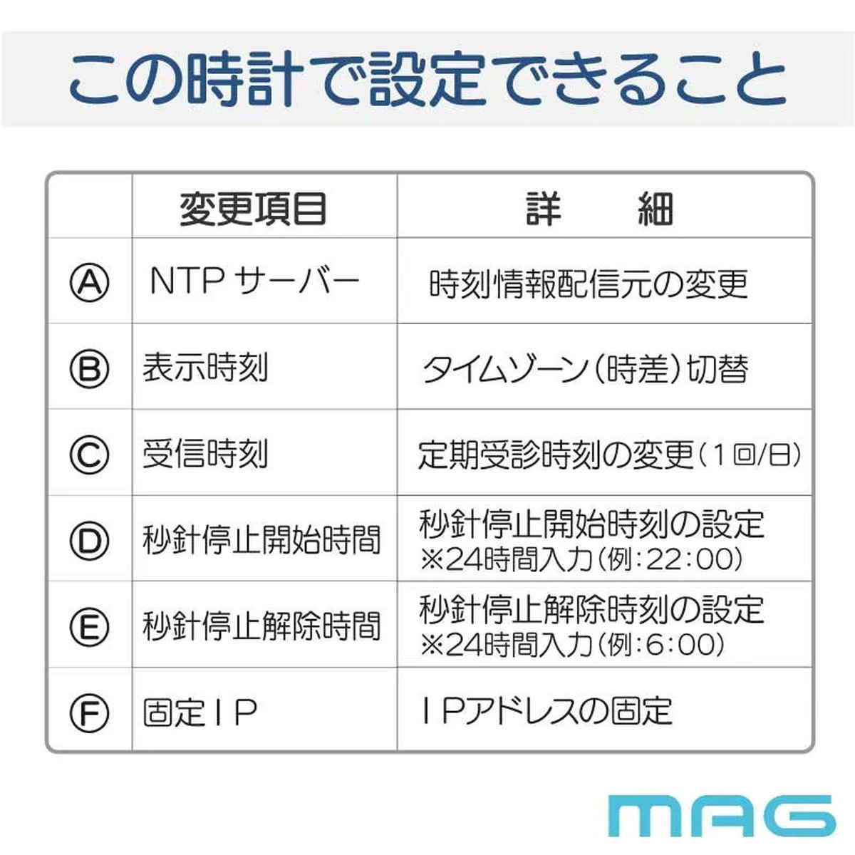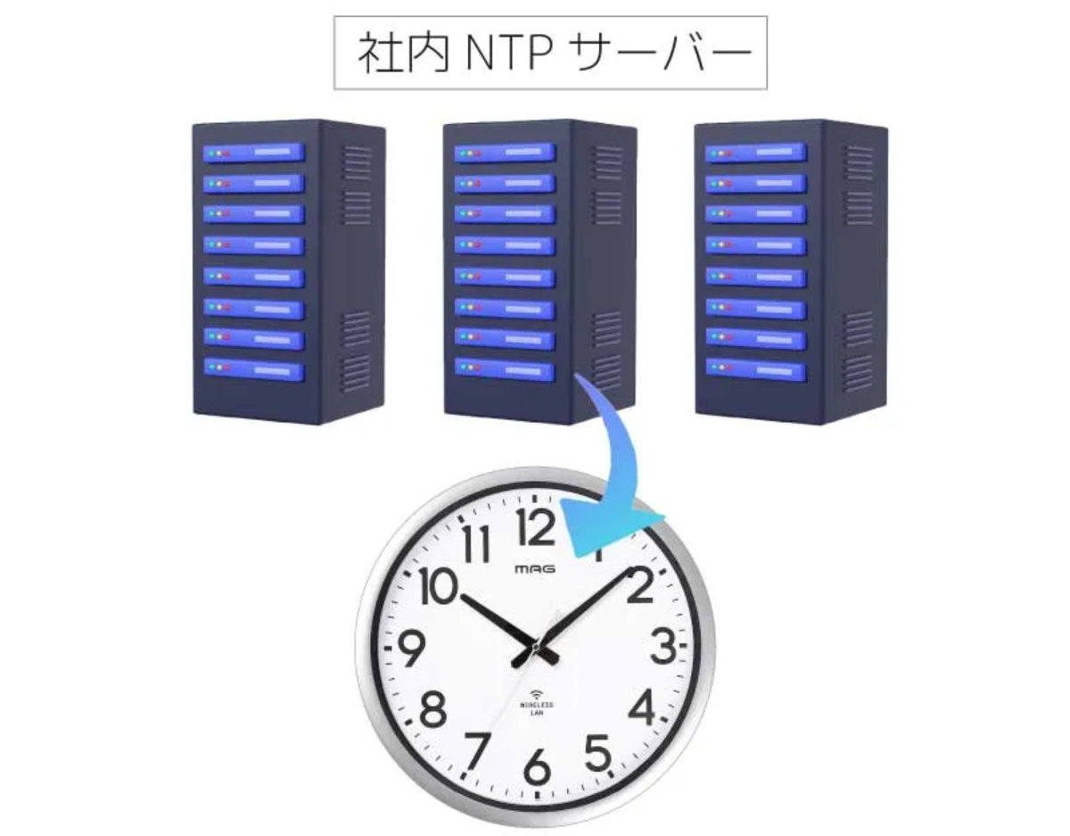 ●同一ネットワークの時刻情報に同期するため、複数設置しても時計ごとのズレが発生しにくい仕様です。