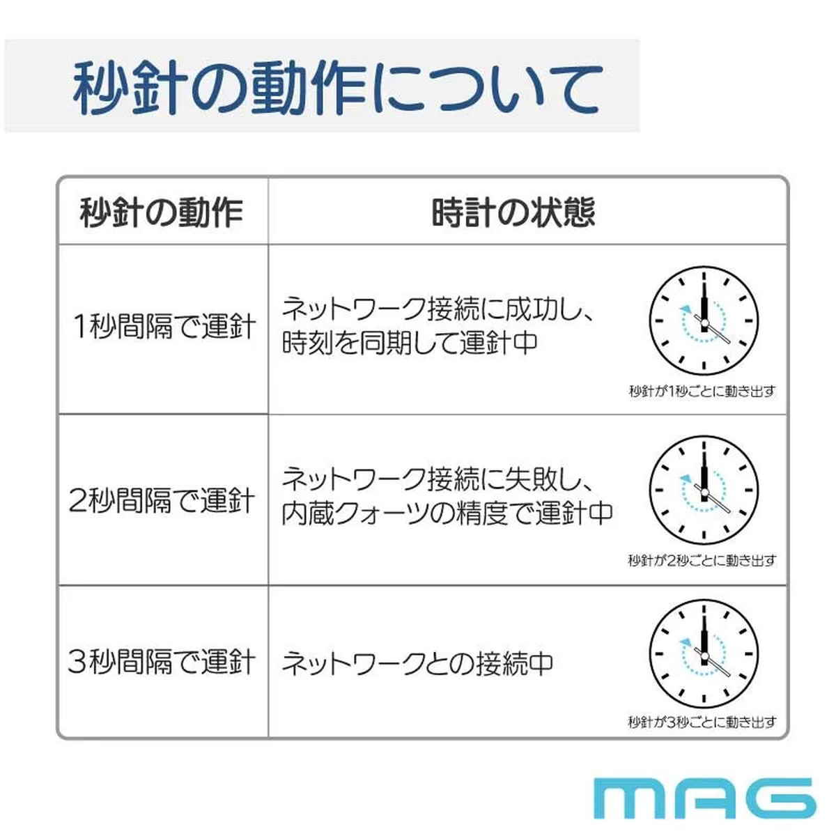 ●秒針の動きでネットワーク接続状況や電池交換時期が分かります。
