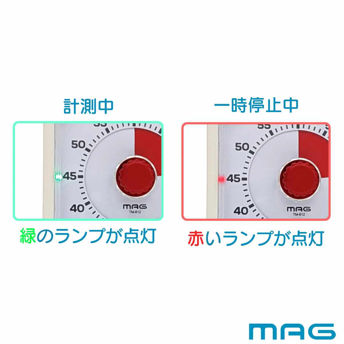 タイマー作動中は緑色のランプが点灯。ひと目で「計測中」であることが分かります。