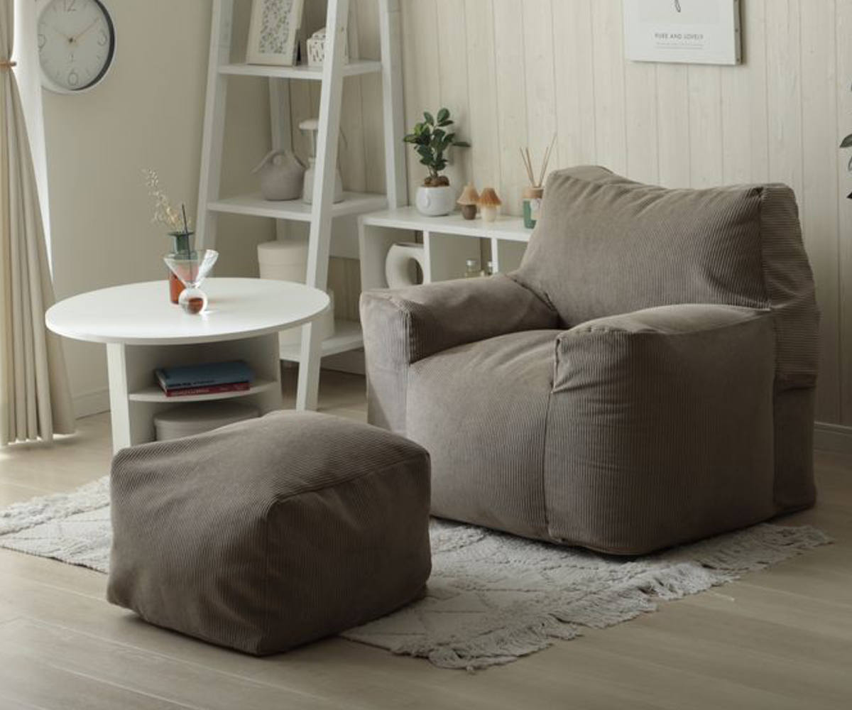 同じスゴビーズを使用したオットマン付き。足を伸ばしてカウチスタイルで使ったり、単体でスツールやクッションとして使ったりと、シーンに合わせて活躍します。