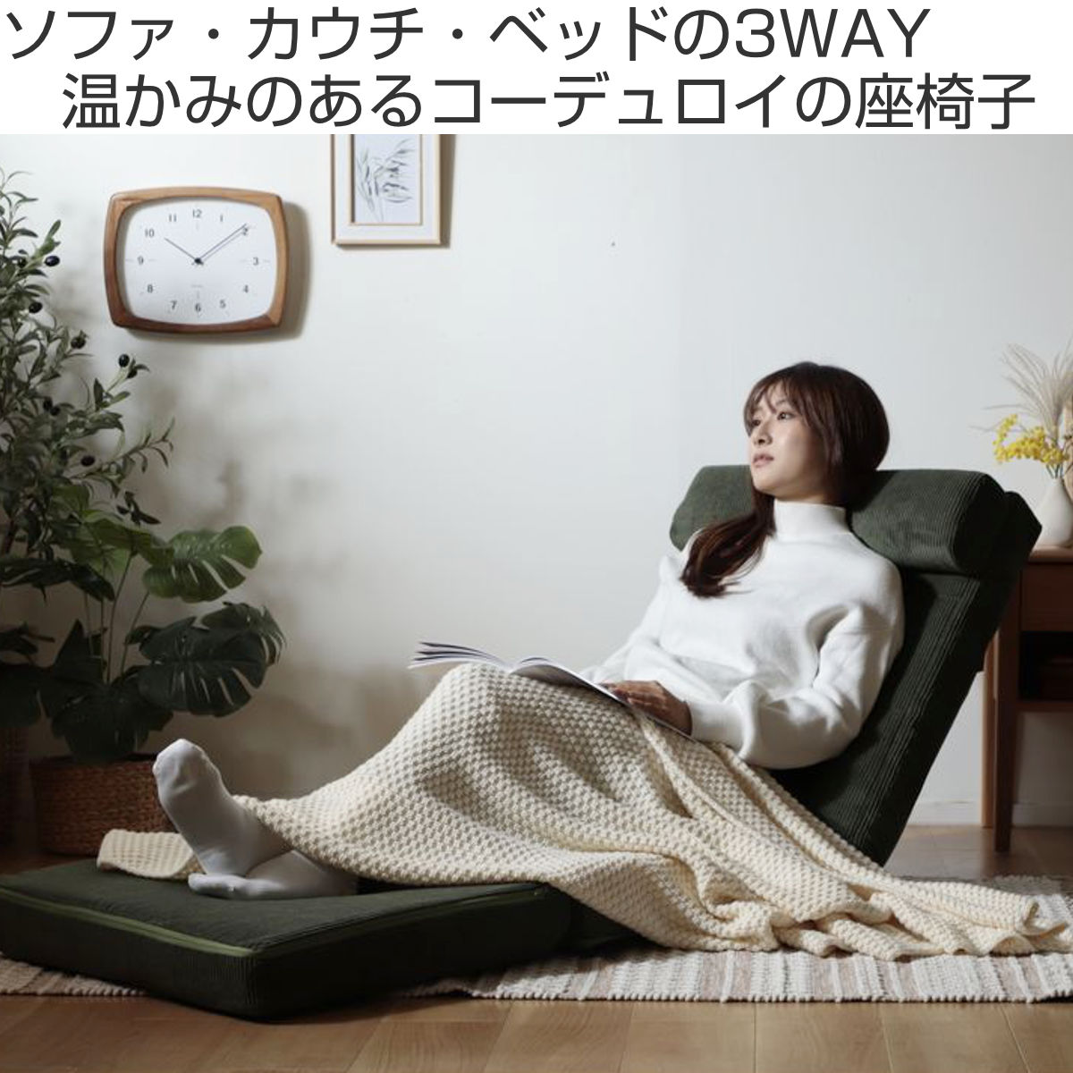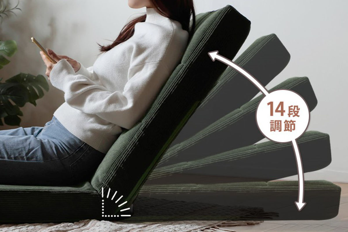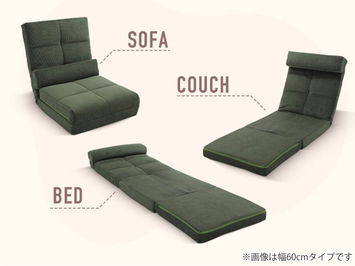 座椅子 幅60cm 3way ローソファ コーディロイ ( ソファ カウチ ベッド リクライニング 14段階 座いす 座イス ソファベッド フルフラット 簡易ベッド 来客用 ハイバック 背もたれ クッション付き 折りたたみ コンパクト ) 【グリーン】