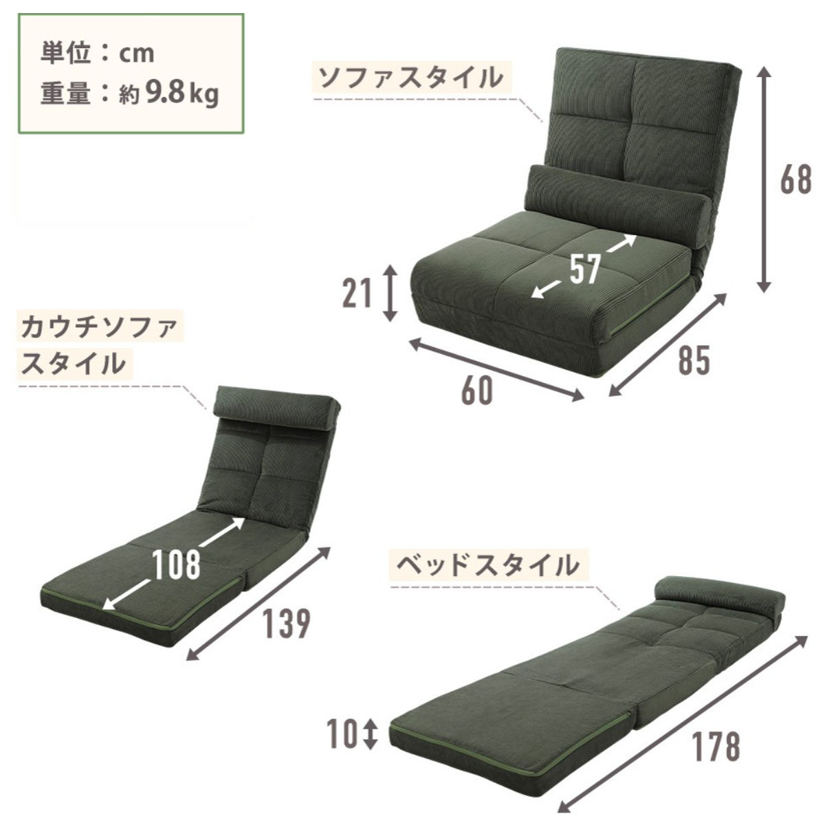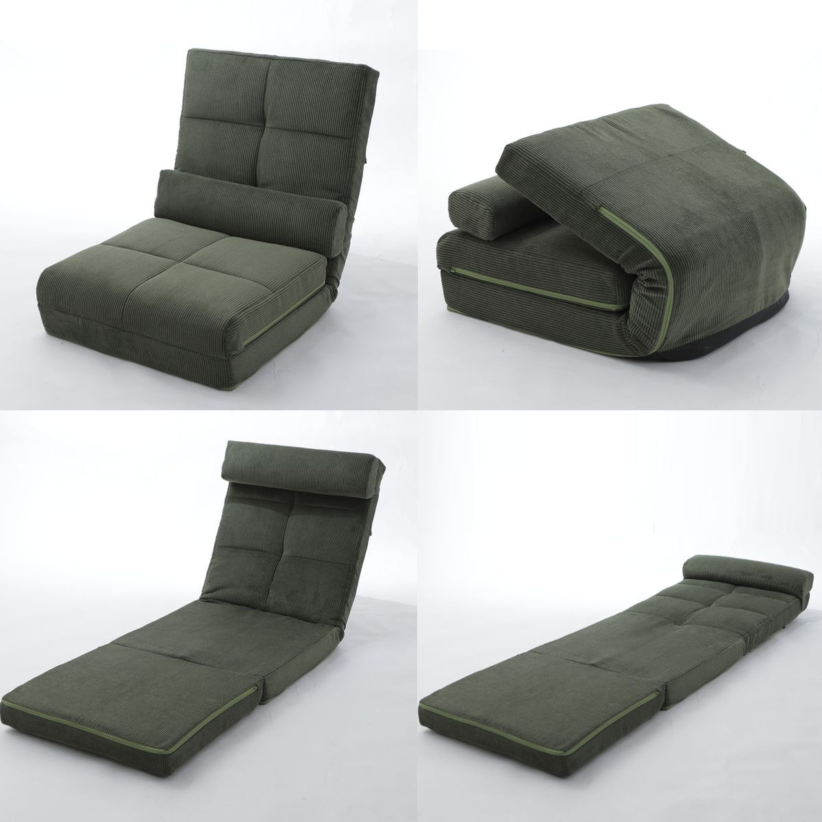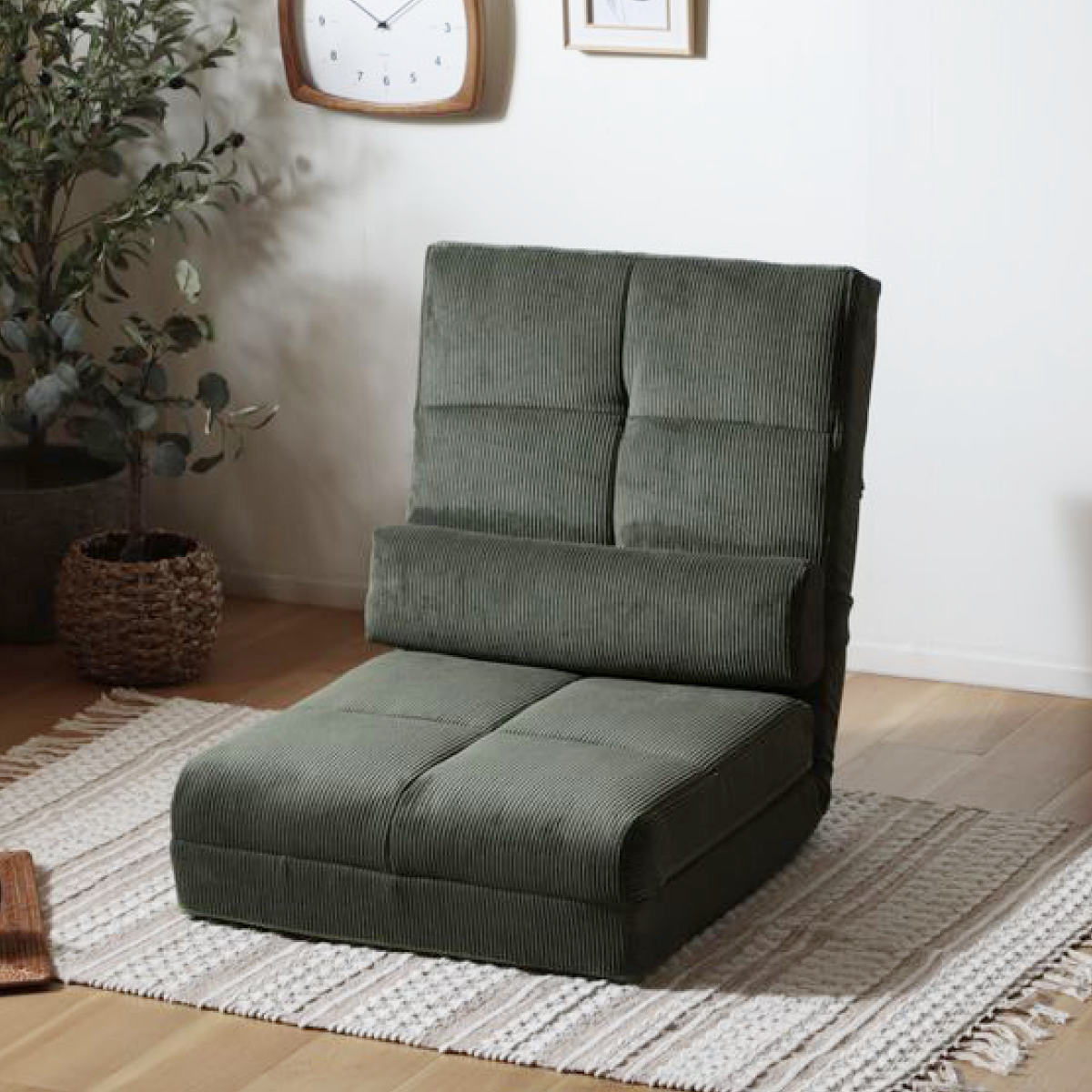 座椅子 幅60cm 3way ローソファ コーディロイ ( ソファ カウチ ベッド リクライニング 14段階 座いす 座イス ソファベッド フルフラット 簡易ベッド 来客用 ハイバック 背もたれ クッション付き 折りたたみ コンパクト ) 【グリーン】