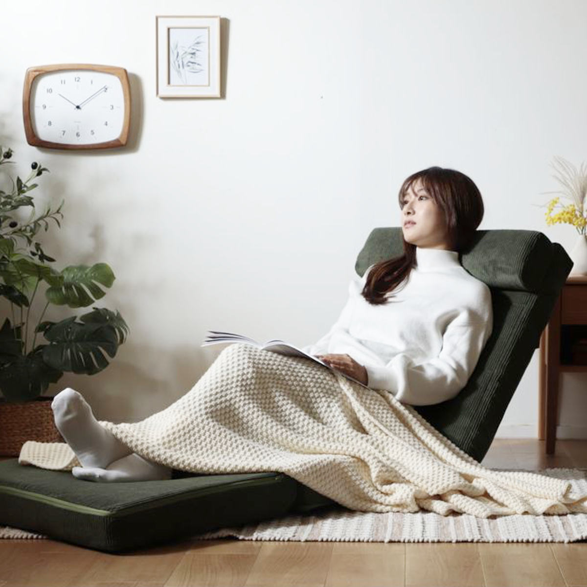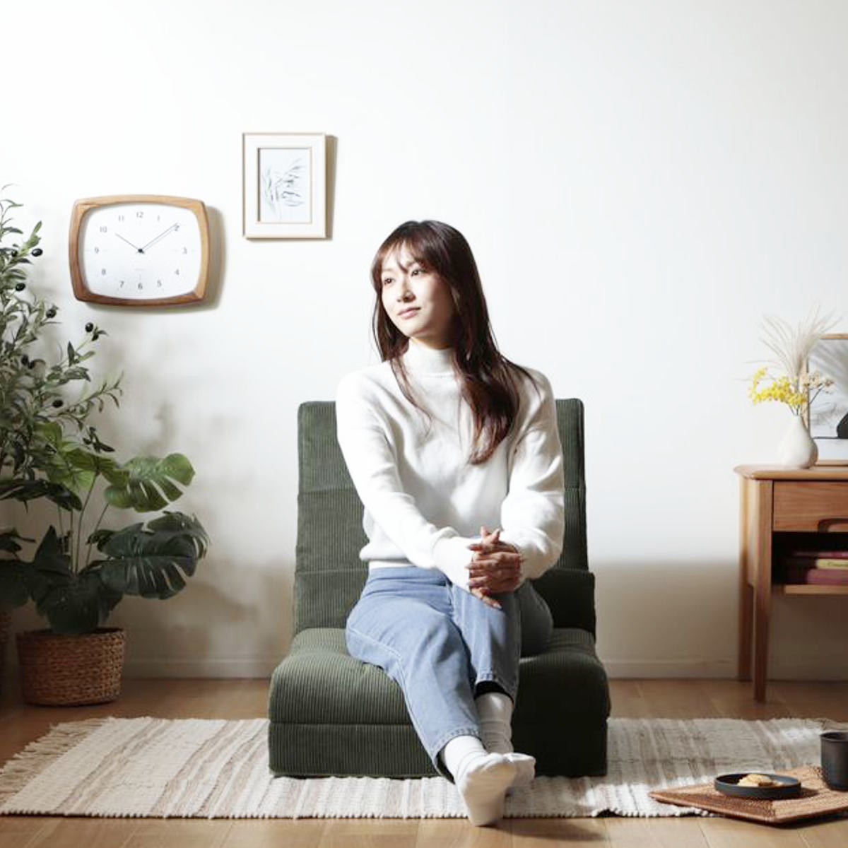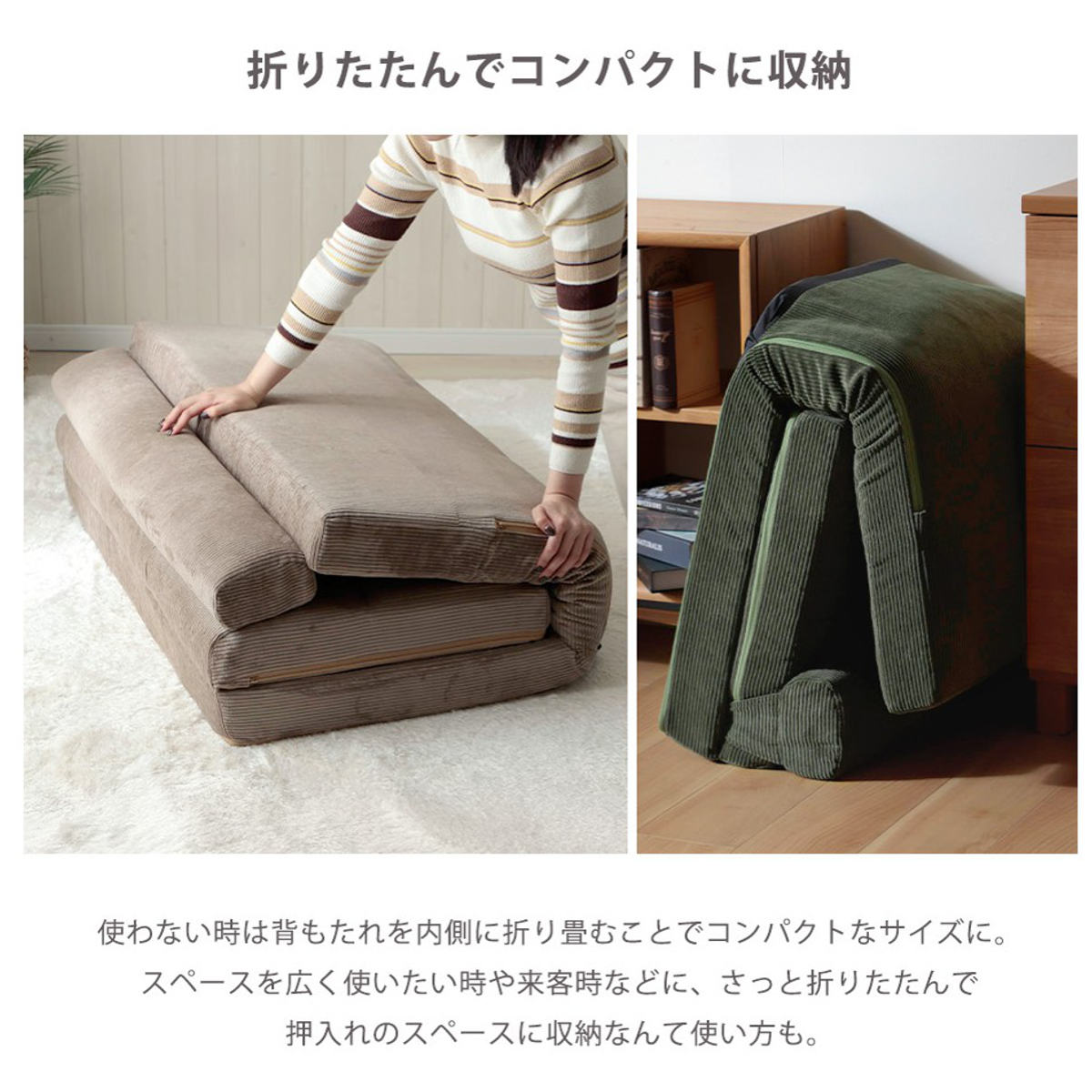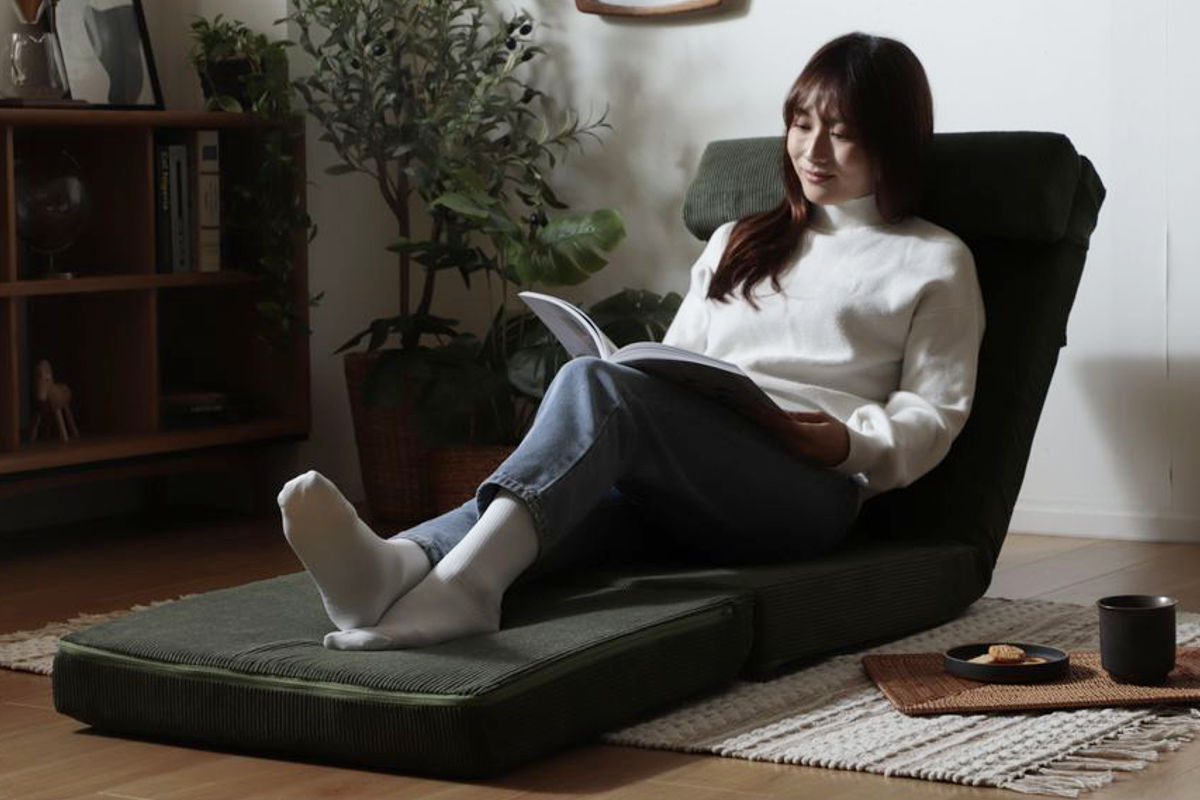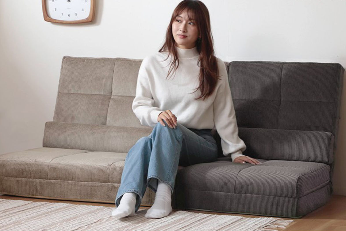 座面はゆとりのある設計で、あぐらをかいたりリラックスした姿勢でも快適。座面を折りたたむことでワイドなソファスタイルになり、ボリュームのある座面で贅沢な座り心地を楽しめます。