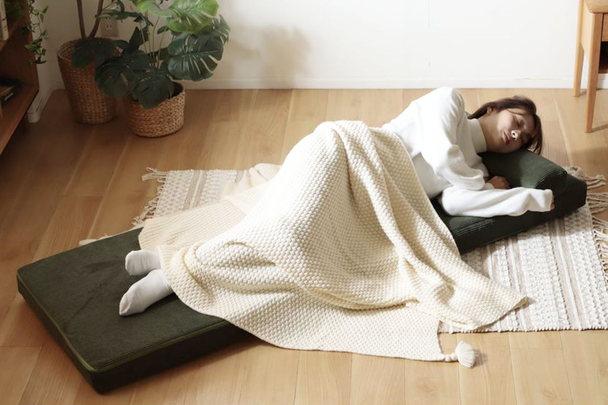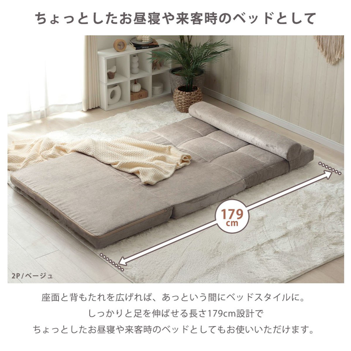フルフラットにすれば、簡易ベッドとして使用可能。クッションを枕代わりにしてお昼寝するのもおすすめです。約179cmの長さがあり、足を伸ばしてくつろげます。来客時や休憩用としても活躍します。