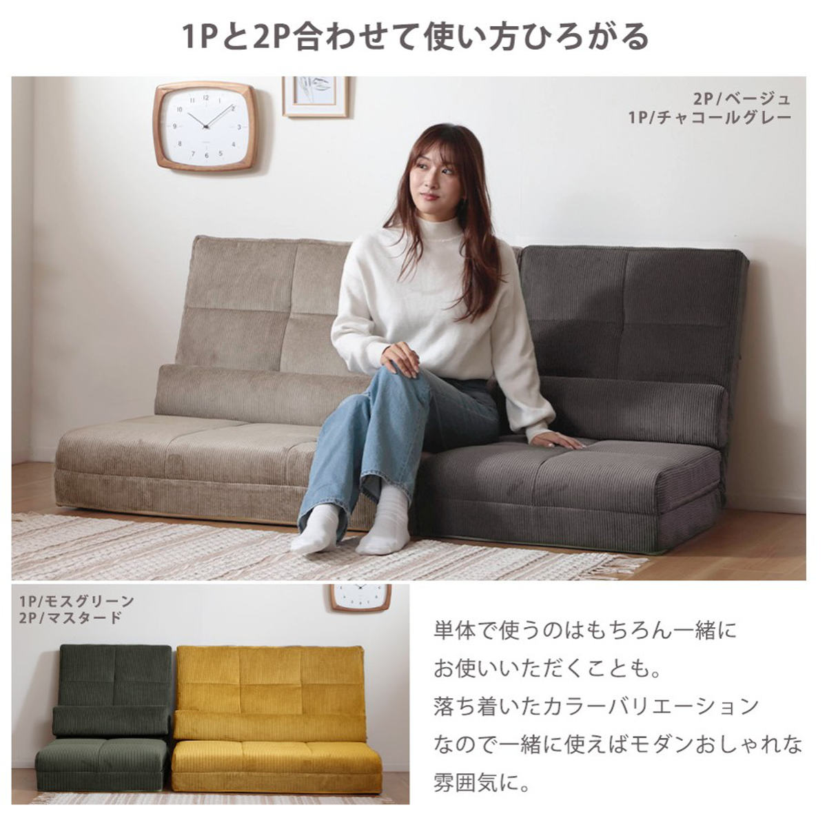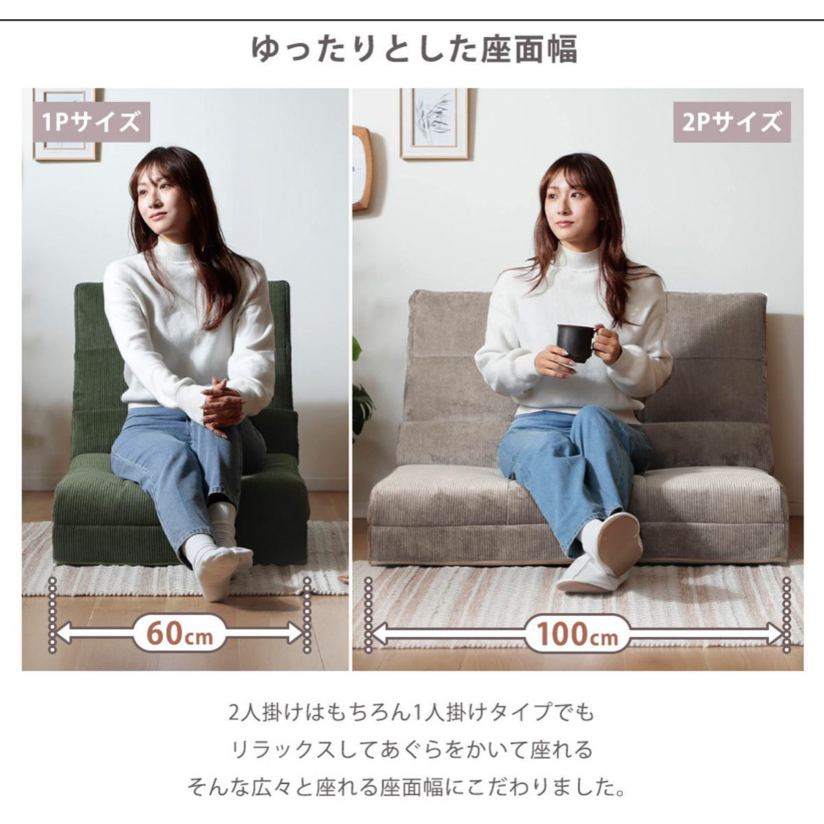 幅60cm(1人掛け)と幅100cm(2人掛け)の2サイズ展開。並べて使えば、より広々としたくつろぎ空間に。ライフスタイルに合わせた買い足しもおすすめです。