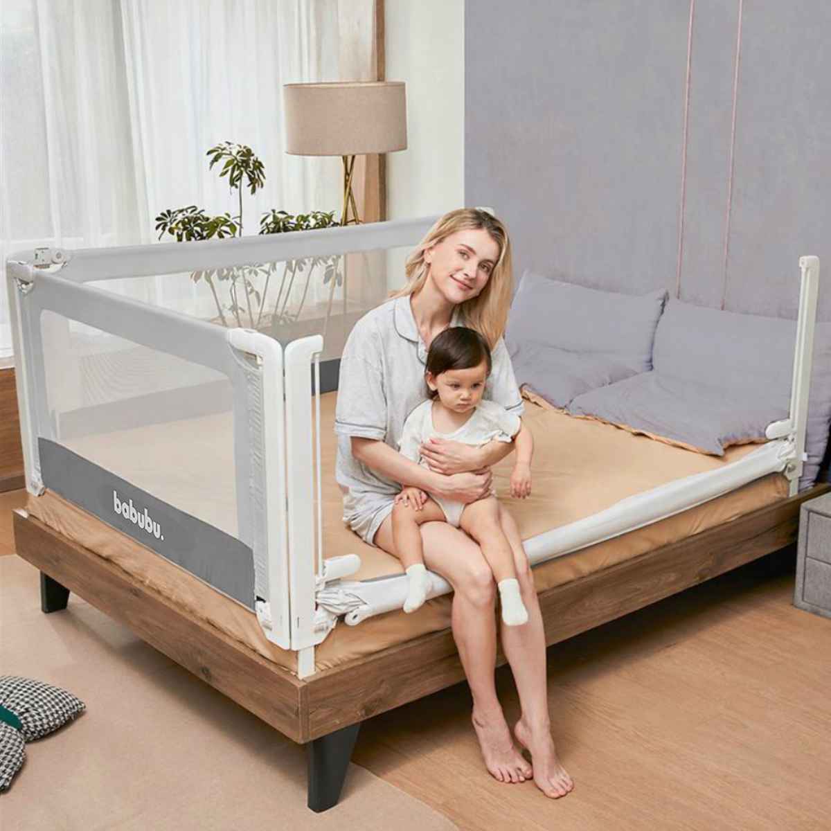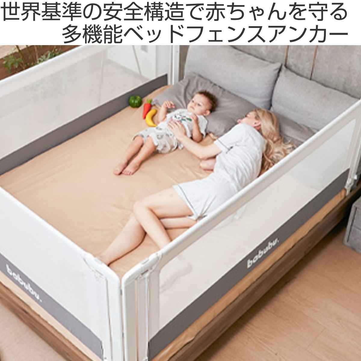 転落や挟まれ事故から赤ちゃんを守る、babubu.のベッドフェンスアンカーです。世界基準を満たした安心構造で、赤ちゃんが動き回っても落下の心配がありません。設置することで、ママ・パパは安心して家事や添い寝ができます。