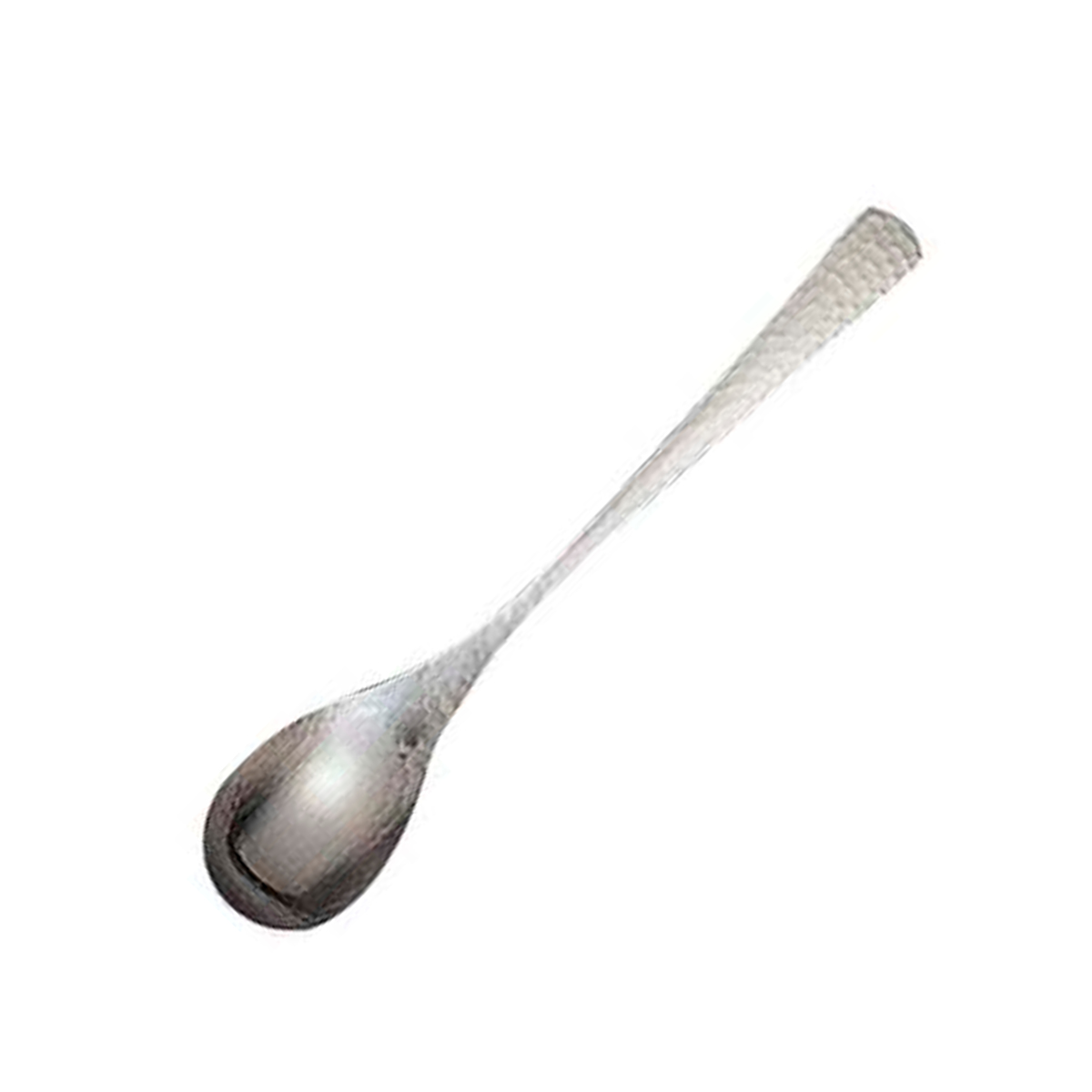 ステンレス素材に施した槌目模様が、光をやわらかく反射するティースプーンです。無機質になりがちな金属に、手仕事の温もりを感じさせる表情をプラスしました。和洋どちらの食卓にも自然になじむ、上品な一本です。
