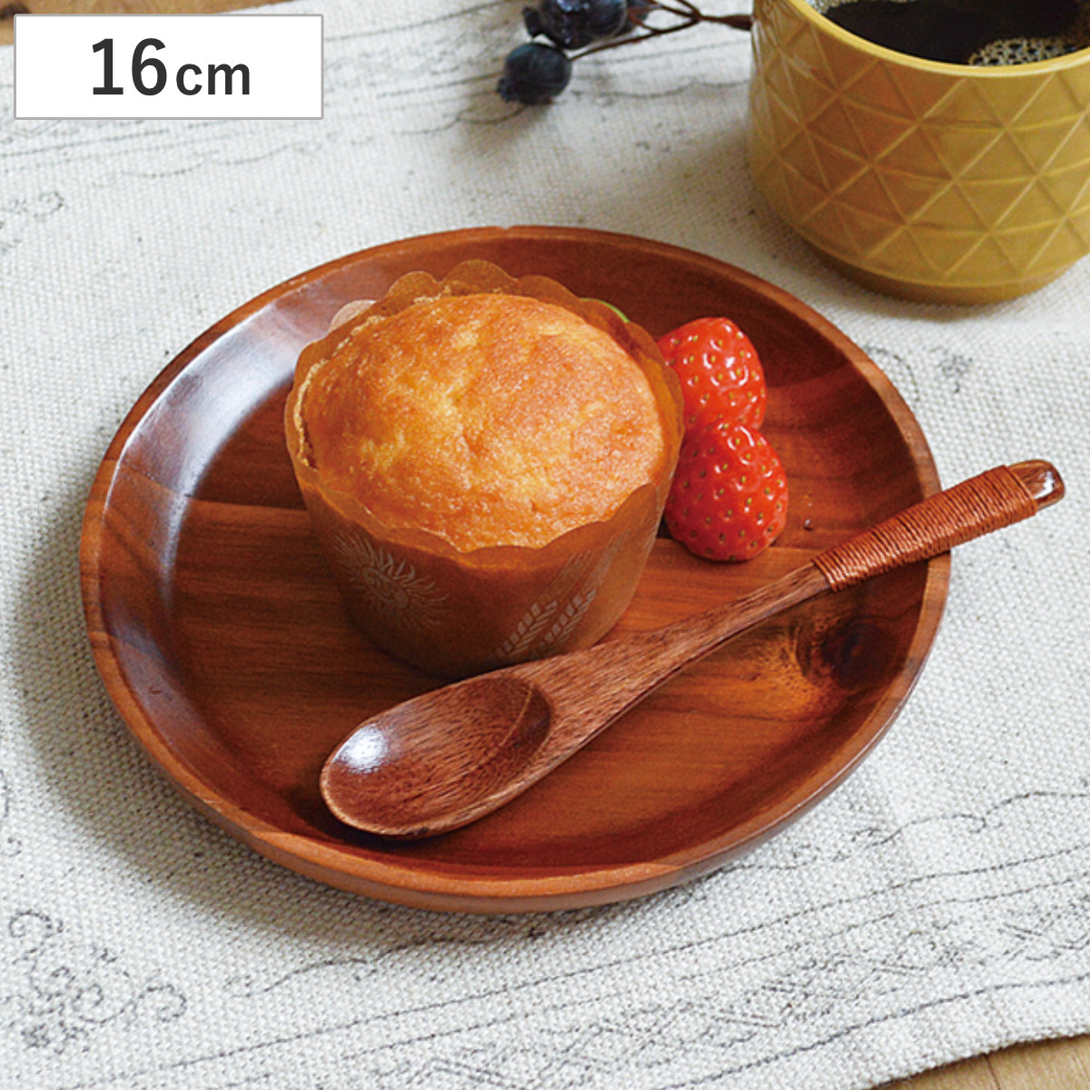 ふちを薄く削った軽いデザインで、普段の食卓にもカフェ風コーデにもマッチします。ベトナム産の天然木を使用し、ひとつひとつ異なる木目の表情が楽しめるアイテムです。