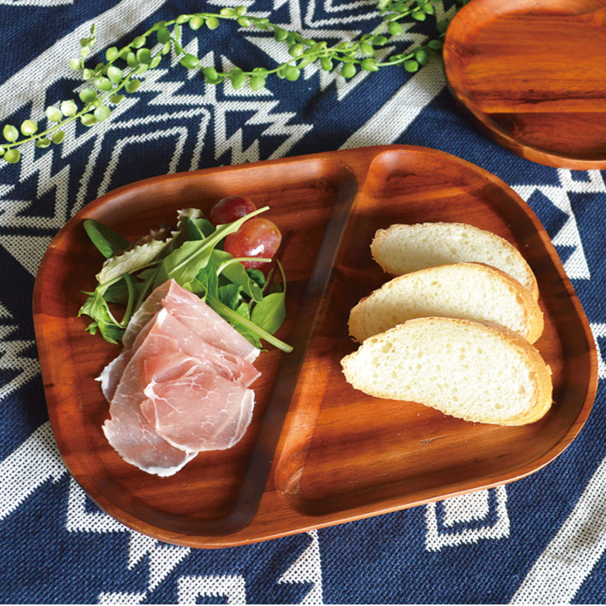 天然木ならではの風合いと木目を活かした仕上がりで、料理を引き立てて見せるプレートです。主菜のパンやご飯と副菜のサラダを分けて盛り付けられる仕切り付きデザインで、1人分のワンプレートごはんにぴったりです。