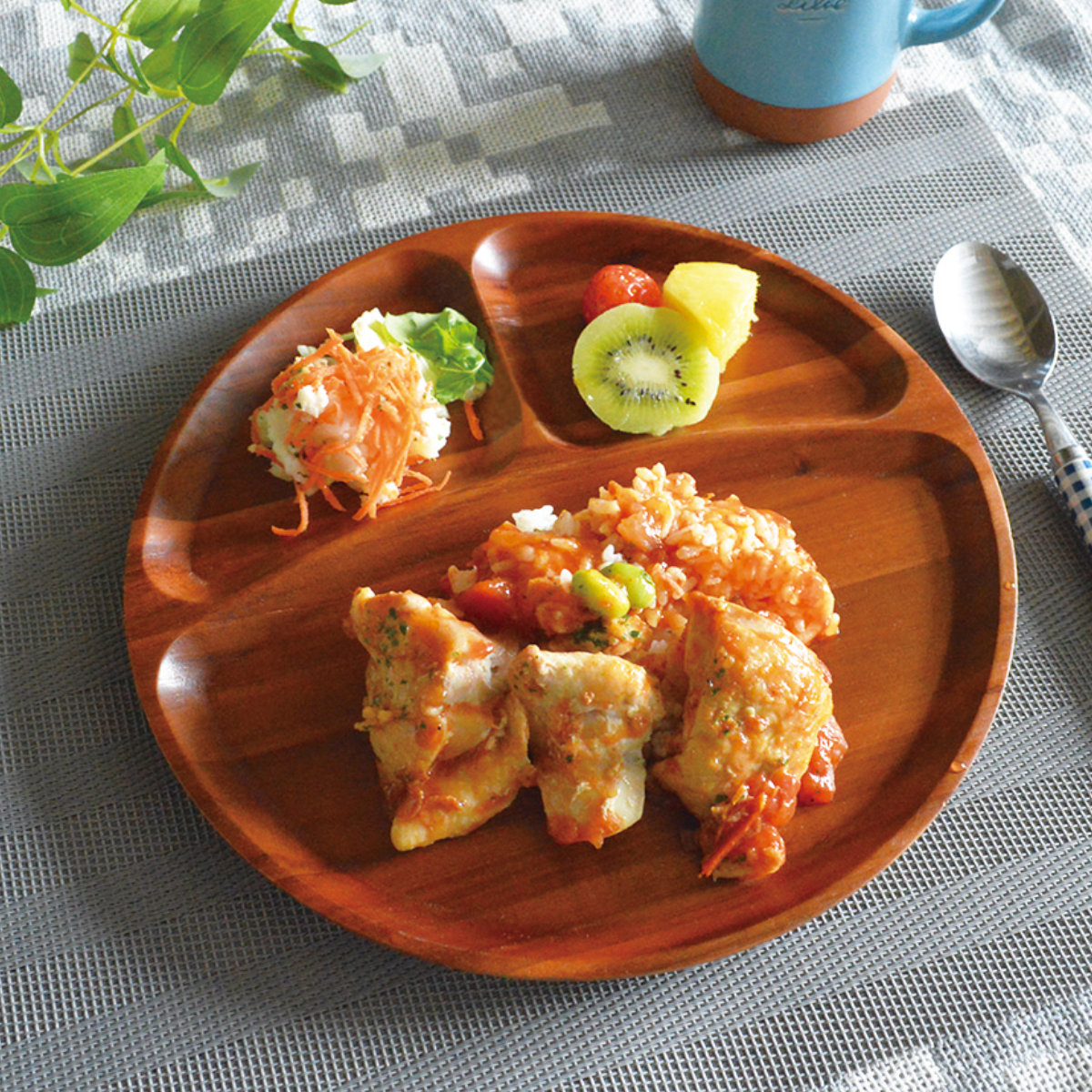 天然木ならではの風合いと木目を活かした仕上がりで、料理を引き立てて見せるプレートです。仕切り付きのデザインで、主菜のおかずや副菜のサラダ、フルーツなどを分けて盛り付けることができ、ワンプレートごはんや朝食プレートにぴったりです。