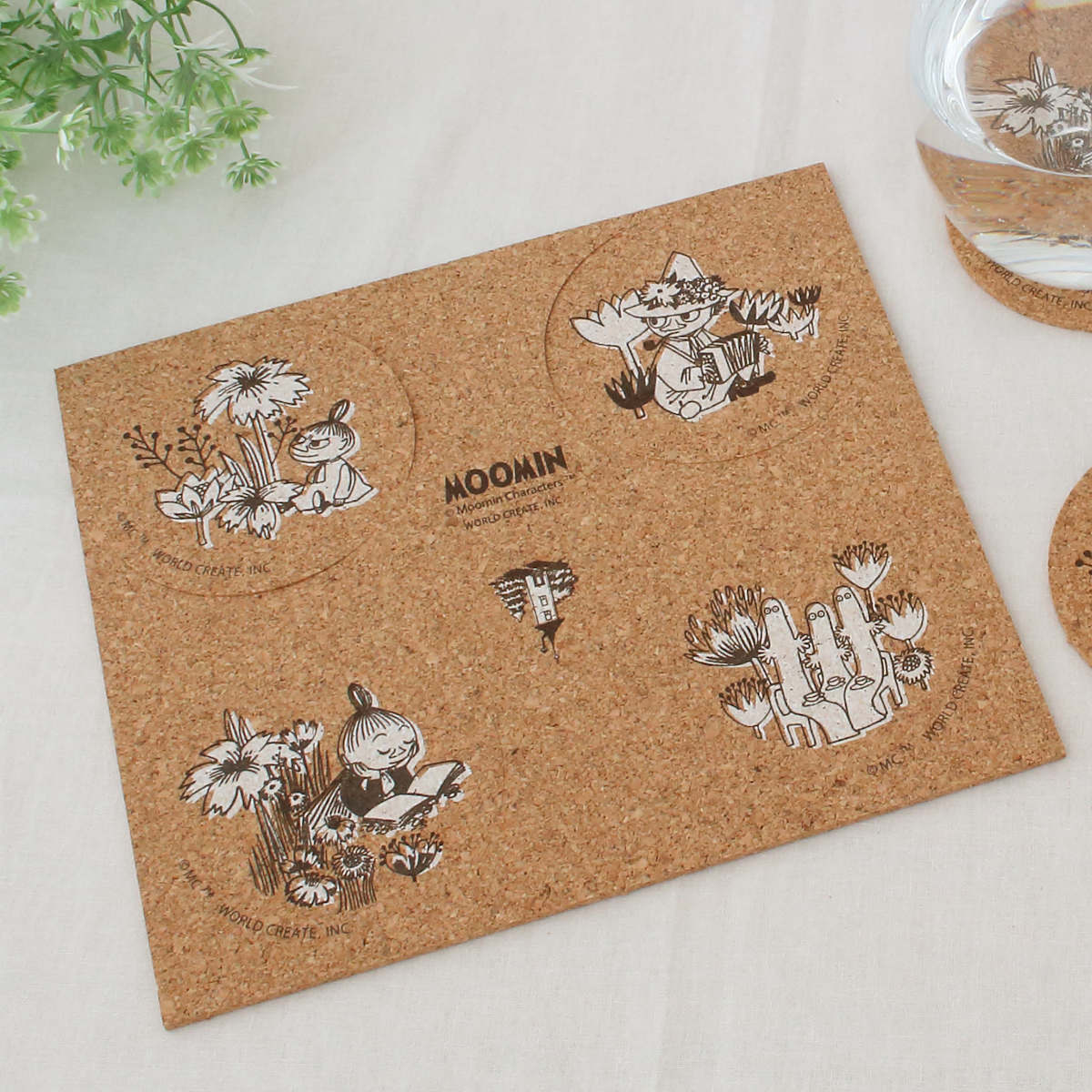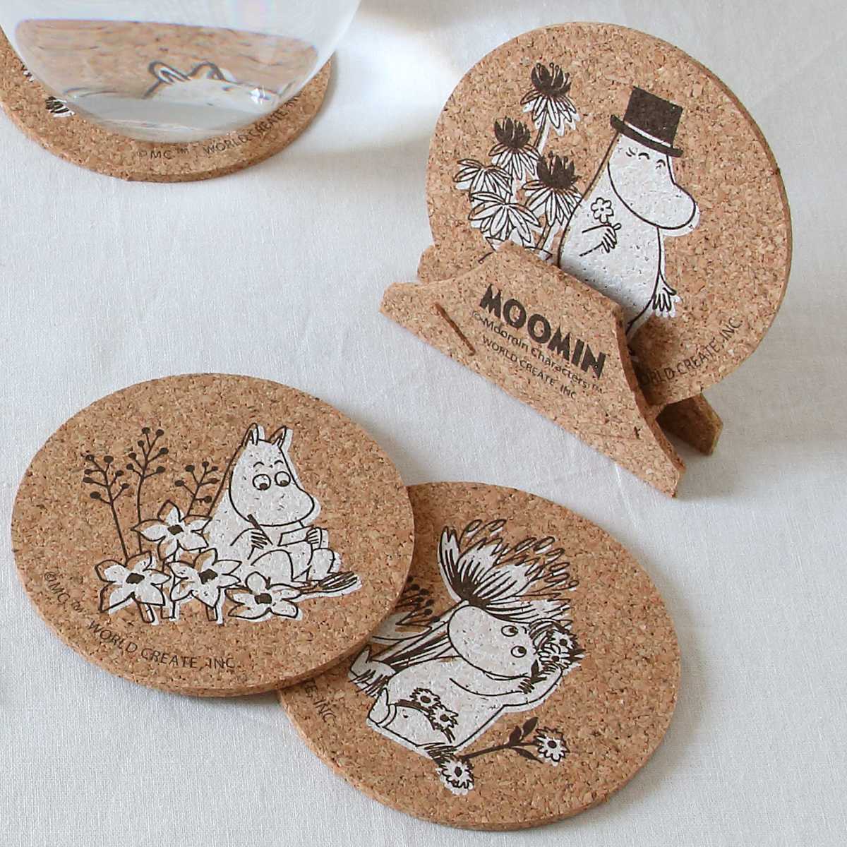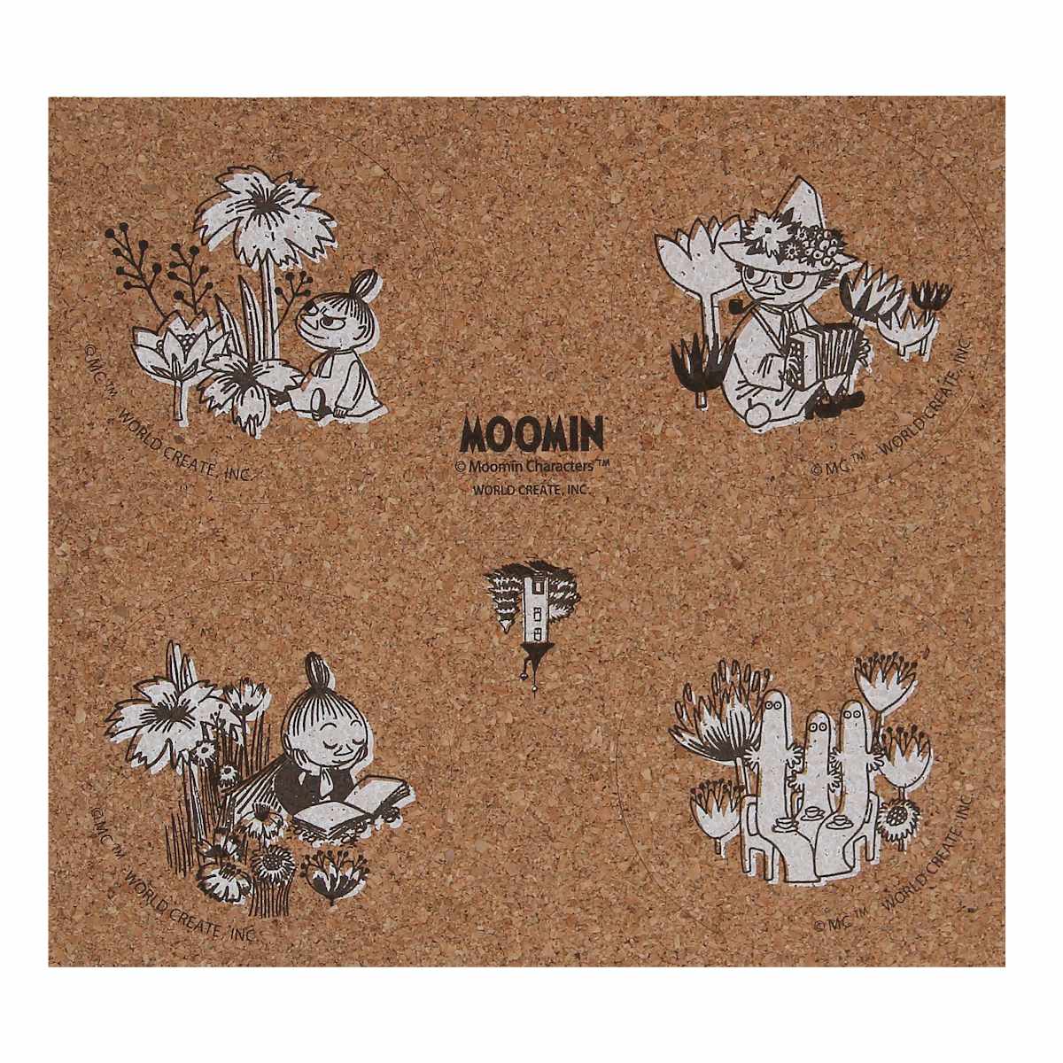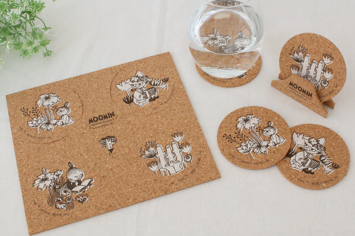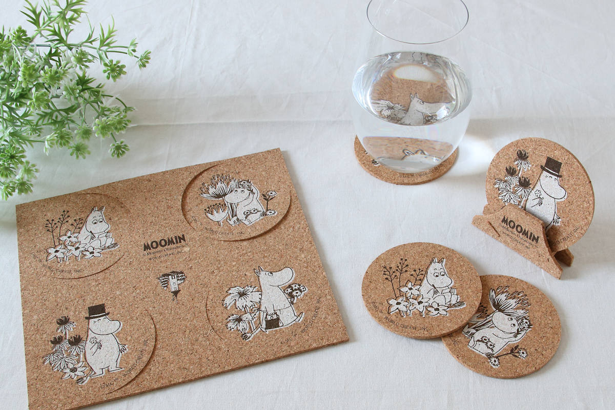 北欧発の人気キャラクター「ムーミン」と仲間たちの世界が楽しめる、飾れて使えるコルク素材のコースター4枚組です。ドリンクを置くだけでなく、飾って楽しめるデザイン性も魅力です。自然な温かみを感じるサステナブルな素材感です。