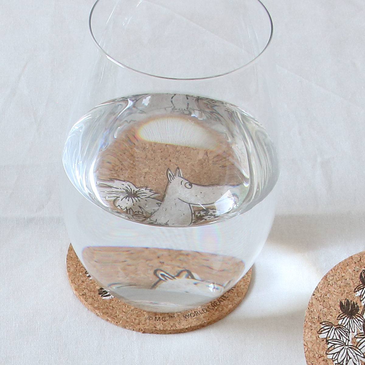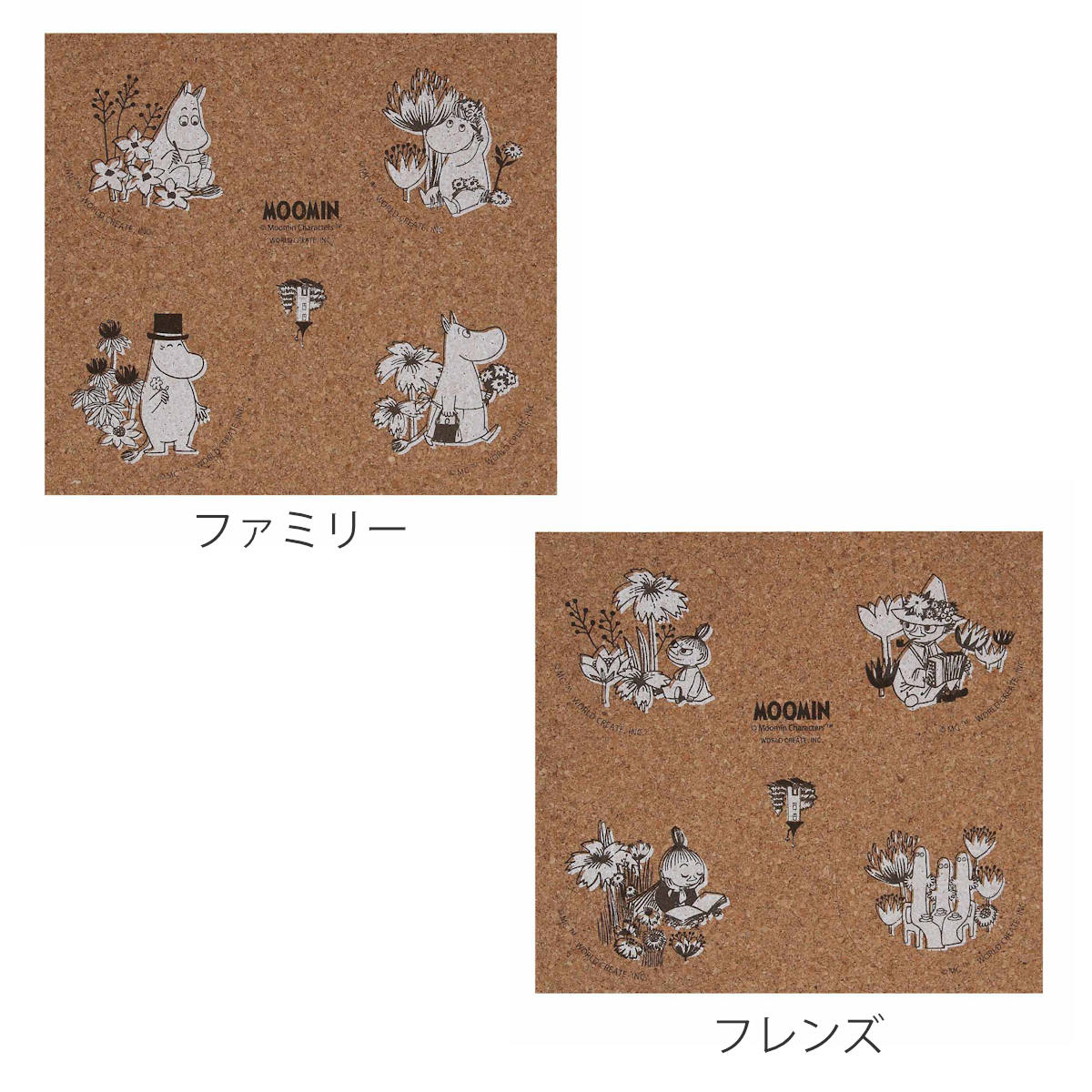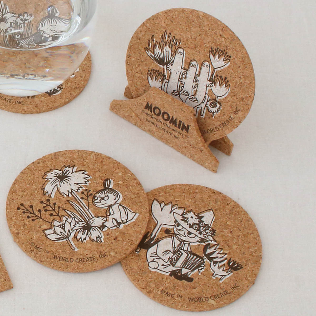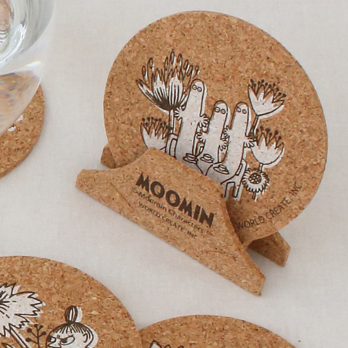 北欧発の人気キャラクター「ムーミン」と仲間たちの世界が楽しめる、飾れて使えるコルク素材のコースター4枚組です。ドリンクを置くだけでなく、飾って楽しめるデザイン性も魅力です。自然な温かみを感じるサステナブルな素材感です。
